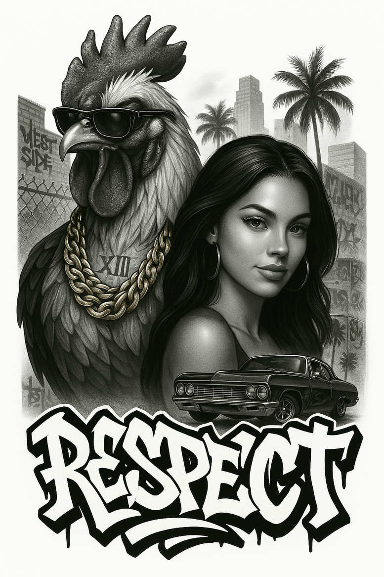 AI-generated tattoo project concept in grayscale blends portraiture, animal symbolism, and urban imagery into a unified tattoo design. The central motif is a tall rooster wearing sunglasses and a heavy gold chain, its plumage textured with stippling and cross-hatching to suggest depth on skin. To its right, a poised woman is rendered with soft realism, her features outlined clearly enough for long-term readability. A vintage car sits at the foreground, its chrome highlights and bold lines contributing a sense of motion and retro attitude. Behind them, a cityscape fades into distance, punctuated by palm trees and weathered walls covered in graffiti that adds street-art energy. A bold ‘RESPECT’ script anchors the lower portion, tying the composition together with a graphic punch. The lighting emphasizes strong darks and midtones, making the piece legible as a tattoo across larger canvases such as the arm, shoulder, chest, or back. Symbolically, the rooster signals vigilance and courage, the woman conveys grace and resolve, the car references ownership of one’s journey, and the graffiti word expresses urban pride and self-respect. The piece uses black ink with careful shading to balance high-contrast silhouettes and subtle gradients, aligning with black and grey, realistic tattoo aesthetics, and the workflow of fine line tattoo accents. As an AI-generated concept, it is meant to be adaptable and easy to customize for different skin tones and placements. For additional motifs, suggestions like lotus flower tattoo, infinity tattoo, tribal tattoo, rose tattoo design, or small flowers could be woven in through a custom tattoo design approach; the composition remains versatile for various body locations and scales. This description includes the language of tattoo culture, weaving terms such as tattoo, tattoo design, meaningful tattoos, small tattoos, flower tattoos, custom tattoo design, Japanese style tattoo, and ink to optimize search relevance while maintaining a professional magazine tone.