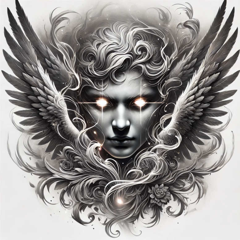 Rendered as an AI-generated tattoo concept, this composition centers on a serene angelic visage framed by expansive wings and swirling hair that dissolves into botanical filigree. The piece embraces a high-contrast black and grey palette, with the eyes rendered as bright focal points that draw the viewer through the composition, and a flower motif at the base anchoring the design—an arrangement suitable for many tattoo design projects. The wings extend outward in a dynamic arc, while the hair flows in curvilinear plumes that merge with ornate curls to create a seamless pattern of negative space and grey shading; it reads as a pattern-rich piece that nods to Japanese style tattoo and tribal tattoo linework. The overall mood is both ethereal and bold, making it ideal for larger body art such as a back or chest piece or as a cover-up to obscure an older tattoo. Although AI-generated, the concept reads with the precision of a professional tattoo design, bridging realism in the facial rendering with decorative elements reminiscent of lotus flower tattoo motifs and the infinity tattoo idea. The motif can be read as a guardian figure, offering symbolism of protection and transformation, with the wings evoking ascent and the flower signifying growth. The piece uses a balanced mix of broad shading and fine lines to establish depth, while the branching filigree provides texture and movement. Given its dark mass and subtle highlights, the image is ideal for a cover-up, where the heavy black areas can effectively conceal previous ink while the lighter whorls add a sense of texture and layering to a new composition. This tattoo concept aligns with trends in black and grey body art, offering a meaningful tattoo option for clients seeking a statement piece with spiritual or protective symbolism. It also demonstrates how a strong silhouette, integrated with floral motifs, can translate into a versatile design suitable for various placements, from shoulder to back, and for clients who appreciate a bold, pattern-rich aesthetic. In addition to its aesthetic appeal, the concept invites exploration of custom tattoo design processes, where the artist can tailor line weight, shading, and scale to fit the client’s anatomy, skin tone, and personal narrative, ensuring a timeless piece that maintains clarity as it ages.