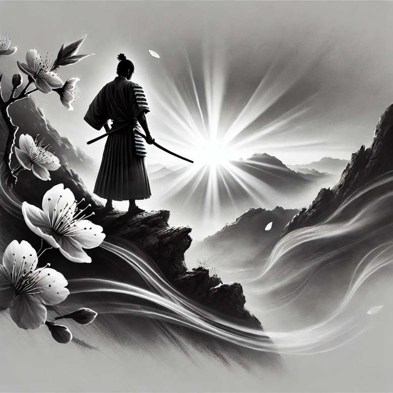 This image presents a black-and-grey Japanese-inspired tattoo concept: a solitary samurai silhouette on a jagged cliff, with a katana resting at his side. The composition draws the eye toward a radiant sunburst that cracks the haze, while wind-swept mountains roll into the distance and waves carve fluid lines through the foreground. A cherry blossom bloom anchors the scene, its petals rendered with delicate stippling and subtle shading to provide a soft counterpoint to the stark figure. The design relies on bold negative space and controlled gradations of black and grey to create depth, contrast, and a sense of timeless stillness. The flowing lines of the waves and the repeated floral motif give the piece a graphic, pattern-like essence that translates well to a tattoo across the shoulder, back, or sleeve. The samurai’s profile is clean and legible, favoring strong outlines and minimal internal detail to honor classic Japanese style while remaining suitable for modern body art. Symbolically, the sun signifies clarity and renewal, while the samurai embodies discipline and resilience in the face of a harsh landscape. The artwork reads crisply in black and grey ink, with texture built through careful shading and stipple work. For cover-up purposes, the dense shadows around the cliff and the bright radiance of the sunburst offer reliable coverage of older tattoos, while the new silhouette and blossoms provide a cohesive narrative and visual anchor. This is an AI-generated tattoo project designed to showcase meaningful tattoos, refined for fine line tattoo aesthetics and versatile placement.