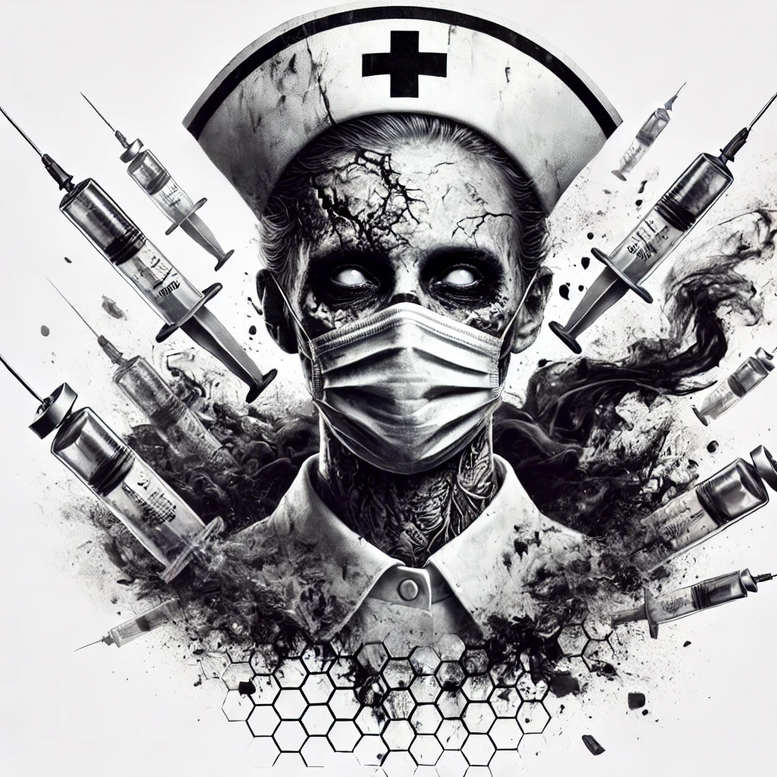 AI-generated tattoo project presented as a bold, cover-up friendly design centered on a nurse figure rendered in black and grey with high-contrast shading. The central figure wears a traditional nurse’s cap bearing a medical cross and a sterile mask that obscures the lower half of the face, creating a stark, haunting focal point. Cracked textures spread across the visible skin hint at a weathered, battle-scarred history, translating into a powerful storytelling tattoo design. Surrounding the figure, syringes orbit like metallic comets, their forms angular and precise, while a fragmented honeycomb pattern anchors the lower portion of the composition, adding graphic geometry and movement. The composition blends realism with graphic elements, allowing for clean lines suited for fine line tattooing as well as deeper black-work for lasting impact. The interplay of shadows and negative space supports a versatile placement on the arm, back, or chest, making it a compelling choice for a first large piece or a dramatic cover-up. Symbolically, the nurse evokes care and danger in equal measure, a meditation on healing under pressure, vulnerability and resilience, and the uncertain edge where medicine meets mortality. The dark atmosphere invites contemplation and makes it a meaningful tattoo design for those who want a bold statement, with keywords such as tattoo, meaningful tattoos, fine line tattoo, lotus flower tattoo, infinity tattoo, tribal tattoo, rose tattoo design, small tattoos, flower tattoos, custom tattoo design, Japanese style tattoo, black and grey, realistic tattoo, body art, ink woven throughout the narrative. As an AI-generated tattoo project, it demonstrates how digital artistry can translate tough themes into a practicable body art concept while maintaining respect for the tattooing craft. Designers and clients alike should note the cover-up potential: heavy shading and deliberate placement of the octagonal honeycomb motif provide opportunities to conceal previous ink with a cohesive, cinematic silhouette. This piece embodies contemporary aesthetics while acknowledging traditional tattoo techniques, presenting a striking, lasting image that aligns with the demand for bold medical or nurse-themed tattoos in black and grey. The work also nods to broader tattoo culture, inviting interpretations ranging from medical service to personal resilience, and showcases how AI-driven design can inform and inspire real-world tattoo projects.
