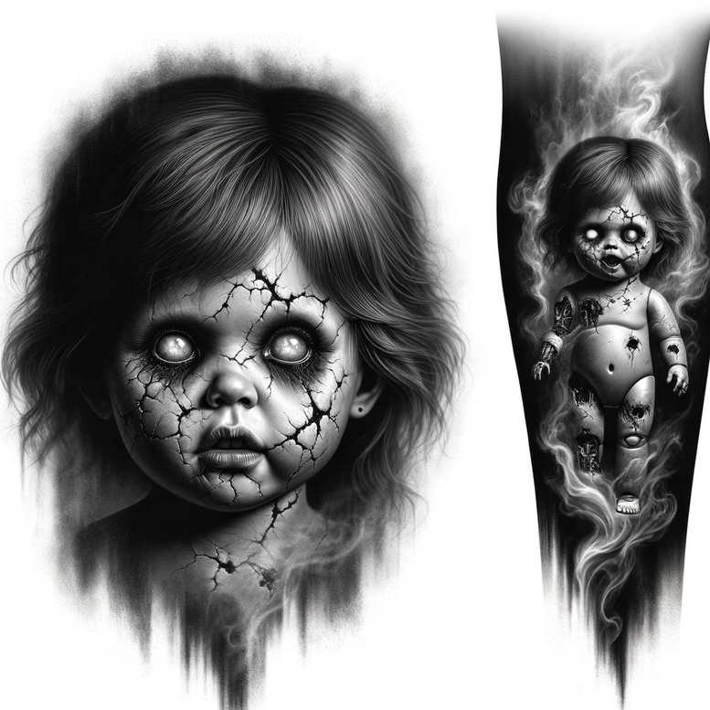 This AI-generated tattoo project presents a dark, highly detailed composition featuring a porcelain doll’s face dissolving into cracks and a full-body doll figure surrounded by smoky tendrils. Executed in black and grey realism, the piece relies on precise shading, cross-hatching, and soft gradient transitions to create haunting depth that reads as both surreal and believable on skin. On the left, the close-up face is fractured by a spiderweb of cracks radiating outward, with pale, lifelike eyes that seem to stare through the surface; on the right, a contoured doll form appears within a vertical panel, its limbs eroded by punctures and stitched seams, while emanating wisps of smoke that weave into negative space. The design is anchored by a strong silhouette and controlled contrast, enabling a confident placement as a cover-up for previous work or as a bold standalone piece. Symbolically, the cracked face evokes memory, vulnerability, and the idea that scars can become art; the ghostly doll hints at innocence lost and endurance, while the smoke suggests transformation and motion through the inked skin. Technically, the tattoo design demonstrates a cohesive grayscale palette, with fine line work used for delicate facial features and crack networks, and broader tonal blocks to define the figure and background. The piece also doubles as a potential pattern-ready motif for larger applications, with repeatable crack patterns and flowing smoke elements that can be extended into sleeves. For those seeking meaningful tattoos, this concept aligns with trends in black and grey, realistic tattoo, and custom tattoo design, while nodding to Japanese style influences through its restrained linework and emphasis on form over color. As an AI-generated concept, it showcases the direction of modern tattoo design—bold, cinematic, and suitable for a cover-up where prior ink needs concealment yet a strong, poetic image remains.