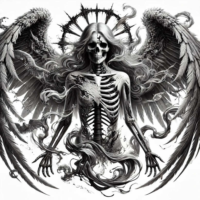 This AI-generated tattoo project presents a dark, black-and-grey skeleton angel rendered with high-contrast realism. The central figure is a skeletal torso with an exposed ribcage and a skull that anchors the composition, while vast wings extend from the back, sweeping outward in dramatic arcs. A shattered halo floats behind the head, adding a gothic focal point as wisps of hair swirl around the shoulders and down the body. The shading alternates between deep blacks and soft greys to sculpt bone structure, fabric remnants, and the fog-like movement that threads through the figure. The design plays with light and negative space to emphasize volume, weight, and motion, making it suitable for a bold back, chest, or arm piece. The motif of mortality and transcendence speaks to meaningful tattoos, and the piece can be adapted to larger canvases or used to conceal an existing tattoo when a cover-up is desired. Although this is an AI-generated tattoo project, it translates well into a traditional tattoo design by a skilled artist who can translate the high-contrast linework into skin. The image leans toward realism with fine-line hints in the hair and feather details, balanced by broad shading that gives mass to the ribcage and wings. The concept embraces universal symbolism—the eternal struggle between light and darkness—while remaining versatile enough for custom tattoo design, whether the client prefers black and grey realism, Japanese-style influences, or a more ornate, ornamental approach. As a body art concept, it invites the wearer to consider themes of life, death, and rebirth within a single, cohesive tattoo design. For SEO and inspiration, this piece aligns with tattoo design trends and can be described through keywords like tattoo, meaningful tattoos, fine line tattoo accents, black and grey realism, tattoo design, lotus flower tattoo or infinity tattoo motifs when incorporated as optional embellishments, and the broad vocabulary of flower tattoos, tribal tattoos, or small tattoos in a cohesive sleeve or chest composition. While intensely dark, the composition remains adaptable; for cover-up purposes, a skilled artist can preserve the dramatic silhouette while concealing existing ink, ensuring a powerful result that harmonizes with the client’s body and skin tone.