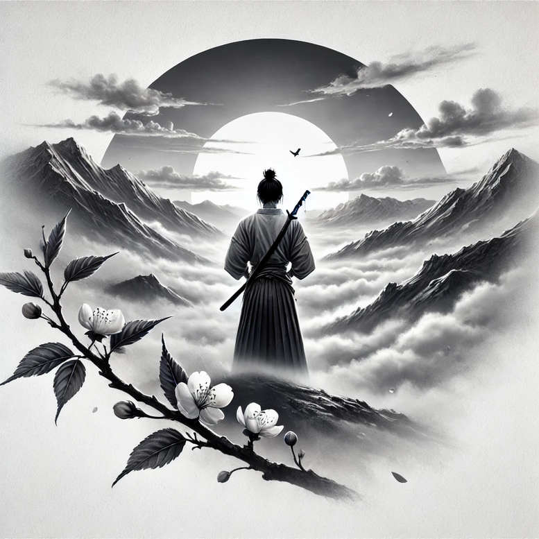 This piece presents a samurai standing with his back to the viewer, a sheathed sword at his side, surveying a jagged, cloud-wrapped landscape. Rendered in black and grey, the composition uses bold shadows and subtle gradients to create depth and drama. The central figure anchors the scene as distant mountains vanish into mist, while a circular sun forms a geometric backdrop that emphasizes balance and focus. A branch bearing blossoms crosses the foreground, its delicate petals offering contrast to the weight of the rocks and the samurai’s stoic silhouette. The result is a cinematic tattoo design that blends realism with graphic geometry, suitable for a larger Japanese style piece or a striking small tattoo. The symbolism is timeless: discipline and honor embodied by the samurai, unity by the circle, and renewal hinted by the blossoms amid a stark landscape. This description also serves as an AI-generated tattoo project example of how algorithmic composition can translate classic motifs into modern ink. For clients seeking a cover-up, the plan’s high-contrast blacks and expansive negative space make it ideal to conceal older work while preserving a powerful narrative. The design invites adaptation into other motifs—lotus flower tattoo, flower tattoos, or combined with mountain or wind elements—without losing its moody, contemplative character. In a studio setting, it can be refined into a fine line tattoo or a realistic black and grey tattoo, ensuring compatibility with various skin tones, sizes, and placements while maintaining the artful, memorable look that defines contemporary body art. The piece also supports a sleeve or back-piece layout, where its layered forms and circular focal point can guide shading and spacing across larger canvases. The focal circle can be extended into halos or wind rings, and the blossoms can be rendered with subtle shading to suggest delicate texture.