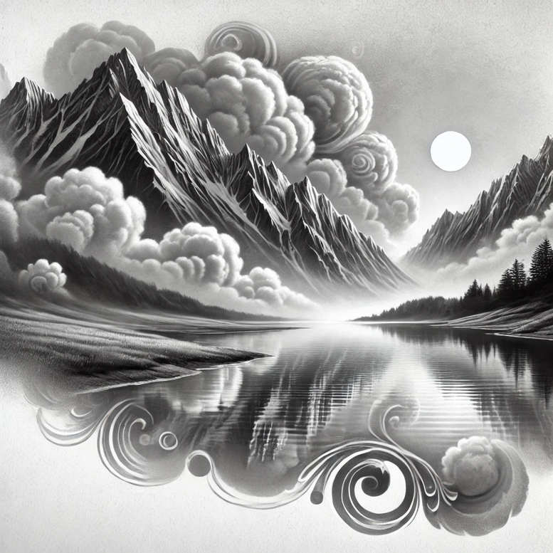 This AI-generated tattoo project presents a moody black and grey landscape, rendered in a high-contrast grayscale that blends photo-realistic mountain peaks with a tranquil lake and curling cloud forms. The composition uses atmospheric perspective: jagged, razor-edged summits rise above the shoreline while soft mist and subtle gradient shading push depth into the background, guiding the eye toward the still water that mirrors the scene. At the foreground, decorative swirl motifs emerge from the shore, creating a graphic pattern that anchors the piece and suggests movement. The sun is depicted as a clean circle, balancing the composition and offering negative space for future additions. The design works well as a standalone tattoo or as a cohesive base for a larger sleeve or back piece, with the mountains providing a bold focal point and the lake serving as a reflective counterpoint for potential colorwork or additional motifs. The piece blends realistic black and grey tattoo technique with stylized embellishments to evoke a dreamlike mood while preserving legibility on skin. The bottom swirls act as a pattern-friendly edge that can accommodate cover-up transitions, making this design particularly suitable for concealing prior marks while still reading as a complete scene. In terms of symbolism, mountains convey strength and endurance, the lake signifies calm reflection, and the circular sun adds balance and a sense of continuity. As an AI-generated tattoo project, this concept demonstrates how digital artistry can inform traditional ink, offering precise linework and shading that translate into durable body art and meaningful tattoos. Keywords woven through include tattoo, tattoo design, meaningful tattoos, fine line tattoo, lotus flower tattoo, infinity tattoo, tribal tattoo, rose tattoo design, small tattoos, flower tattoos, custom tattoo design, Japanese style tattoo, black and grey, realistic tattoo, body art, ink.