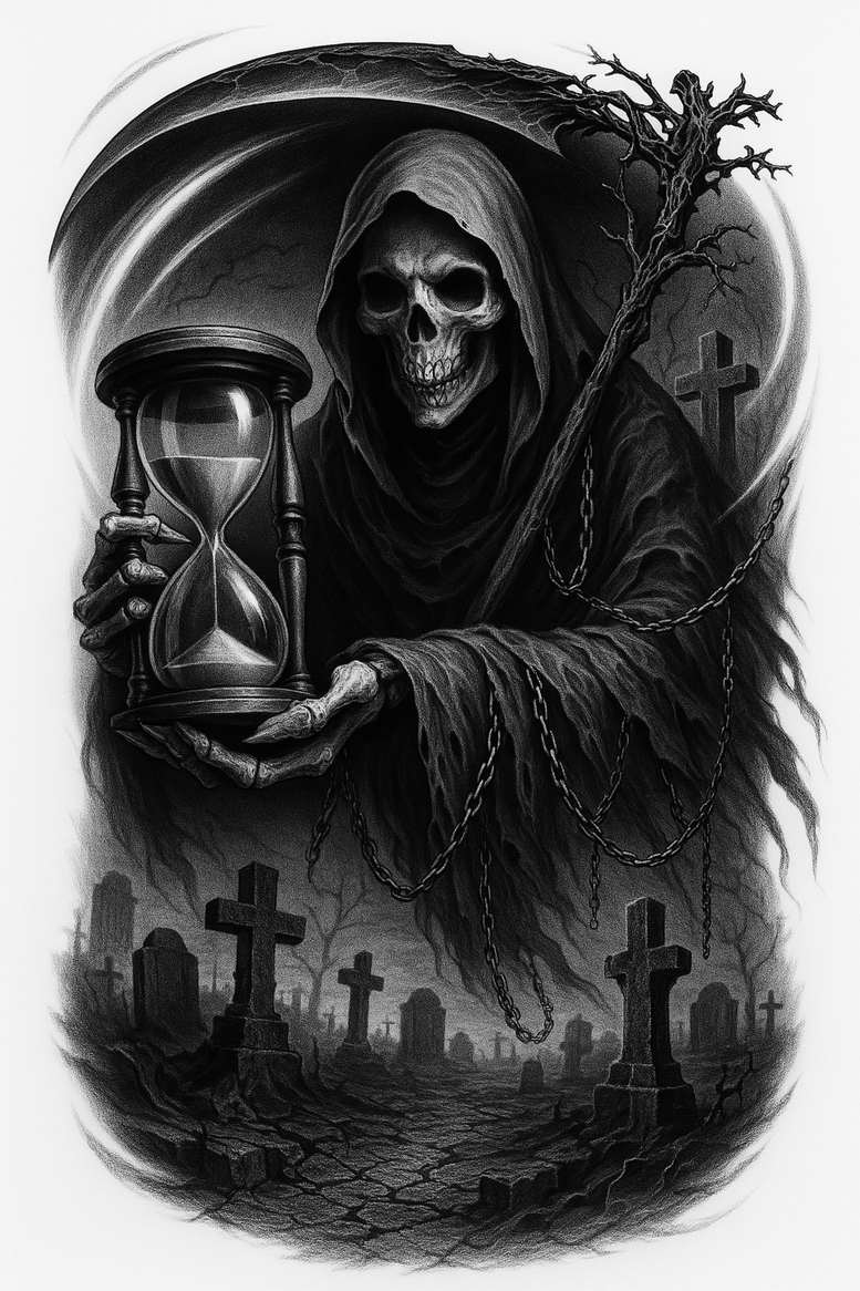 This AI-generated tattoo project presents a dark, monochrome scene of a hooded Grim Reaper clutching an hourglass, with chains and crosses scattered across a desolate graveyard. Rendered in black and grey with meticulous shading, the composition relies on bold contrasts to create depth and a haunting, three-dimensional feel. The skeletal figure emerges from the hood while the cloak billows, directing attention to the hourglass as a symbol of time running out. Chains coil around the arms and torso, and weathered crosses rise from cracked earth, reinforcing mortality, judgment, and confinement. The hourglass edges are crisp, the sand rendered as soft gradients, giving a sense of motion and inexorable passage. The ground texture features cracked soil and scattered gravestones that lean toward decay, while a pale fog underlines the somber mood. This piece is designed as a cover-up-ready tattoo, best suited for a large canvas such as the back or chest, where negative space can frame the central figure and accommodate existing ink. The restrained black-and-grey palette increases contrast and legibility on skin, making it a strong fit for realistic black and grey tattoo styles and for meaningful tattoos that tell a story. In terms of technique, expect tight line work on the skeleton, precise hatching for shading, and soft airbrush transitions on the cloak to achieve a Gothic, lifelike mood. The composition aligns with themes of mortality and fate and will appeal to collectors who favor custom tattoo design, dark fantasy elements, and body art with a powerful narrative. This AI-generated tattoo project illustrates how a single morbid motif can be expanded into a cover-up capable design while preserving detail and impact.