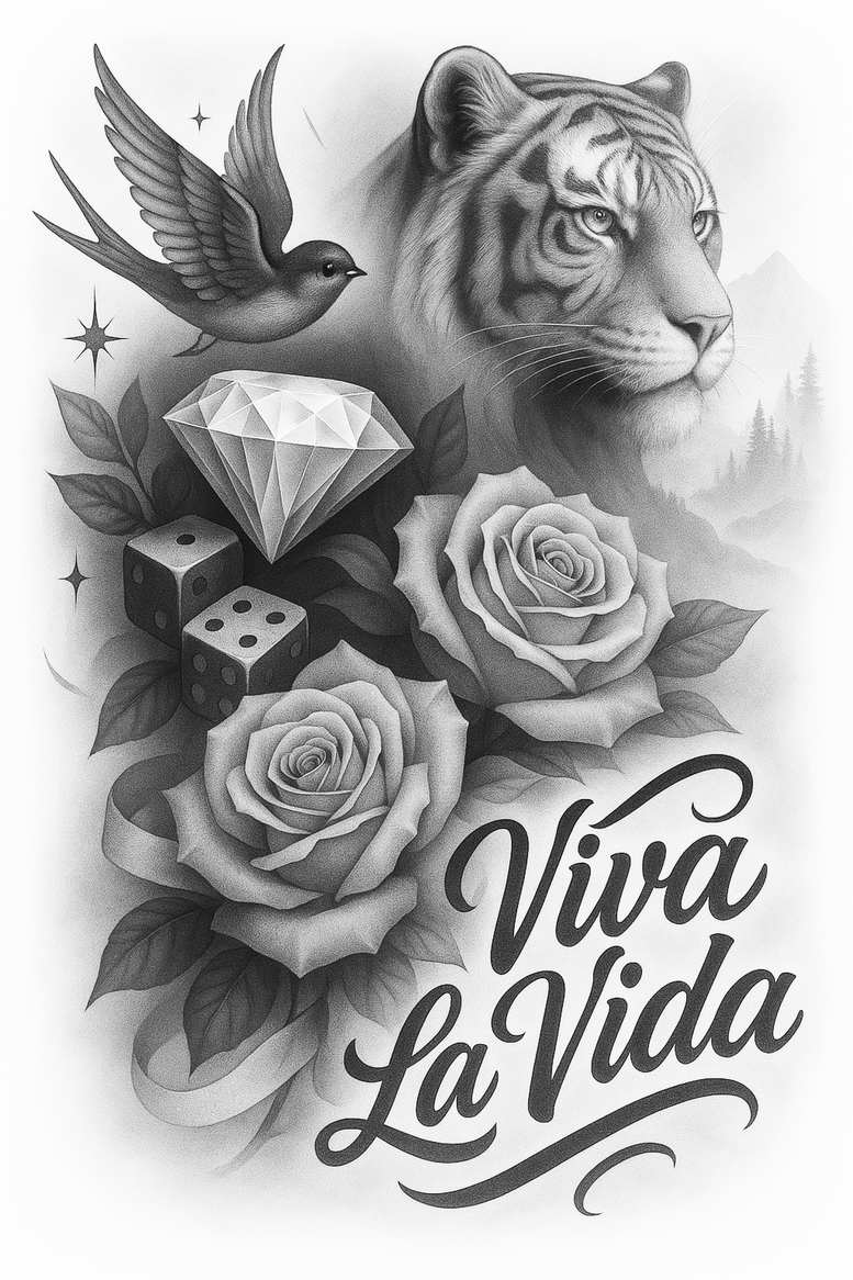 This is an AI-generated tattoo project exploring a dense monochrome composition centered on a tiger head drawn with realistic black and grey shading. A bird in flight provides movement across the scene while a faceted diamond and a pair of dice introduce graphic pattern and geometric contrast to the organic forms, and two roses with curling petals weave through the composition, all framed by leaves that guide the eye toward the flowing Viva La Vida script at the lower right. A misty mountain backdrop adds depth and helps anchor the piece in a timeless mood. The result is a bold tattoo design that balances feral power with romantic symbolism, making it suitable for placements—from shoulder to back—and especially well suited for cover-up due to dense shading and strong silhouettes. The work integrates elements of meaningful tattoos: the tiger evokes strength and protection, the roses symbolize love and beauty, the diamond stands for clarity, and the dice nod to chance and destiny, while the script resonates as a life-affirming mantra. The piece also nods to classic black and grey realism and contemporary geometric accents, offering a versatile template for rose tattoo design enthusiasts, small tattoo concepts, or full-sized body art commissions. With careful line work and smooth tonal transitions, this design demonstrates how an AI-assisted process can yield a refined concept ripe for ink, while remaining faithful to traditional craft, ink lineage, and Japanese-inspired motifs that celebrate bold contrasts, depth, and permanence. For clients seeking a powerful cover-up solution, the combination of dark shading, layered petals, and strong silhouettes ensures concealment of underlying tattoos while delivering an aesthetically striking, meaningful tattoo design.