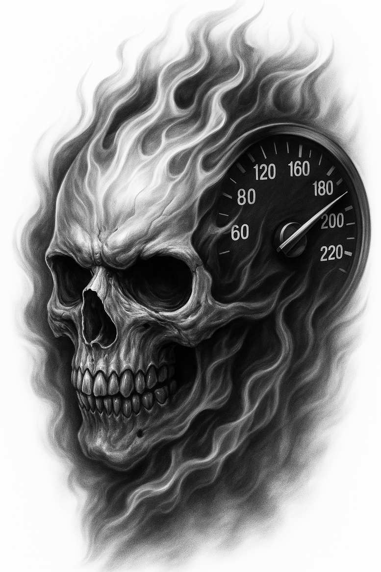 This is an AI-generated tattoo project exploring a bold cover-up concept: a skull formed from smoky, feathered black and grey flames that engulf a speedometer gauge. The composition sits in grayscale and relies on high-contrast shading to create depth in the skull’s hollows, the enamel-gloss teeth, and the curving fire trails that wrap around the dial. Rendered with a realistic approach, the piece emphasizes texture—bone, smoke, and metal—while keeping the design compact enough for a full forearm or upper-arm canvas. The speedometer needle sweeps toward the edge of the skull, suggesting motion and the relentless passage of time, a motif that can carry personal symbolism about urgency, mortality, or the velocity of life. In this concept, graphic patterns appear in the flame ribbons and the circular gauge, giving the piece a cohesive rhythm that translates well in black and grey ink. The image has strong cover-up potential; the deep blacks and dense shading are ideal for masking existing tattoos beneath, while allowing new lines to flow over and blend with the background. As an AI-generated tattoo project, it demonstrates how digital concept art can inform traditional tattoo design, offering a realistic, high-contrast reference for tattoo artists seeking a custom tattoo design with a dark, menacing vibe. Keywords such as tattoo, tattoo design, meaningful tattoos, black and grey, realistic tattoo, custom tattoo design, body art, ink, small tattoos all align with the concept, making it suitable for clients who want a dramatic, line-weight sensitive piece. The overall mood blends Gothic symbolism with modern mechanical imagery, inviting interpretation about time, risk, and change. For those considering a cover-up, this piece delivers bold silhouette, dense shading, and textured detail to conceal prior work while offering a memorable image that can be refined by the tattoo artist for personal symbolism or stylistic tweaks.
