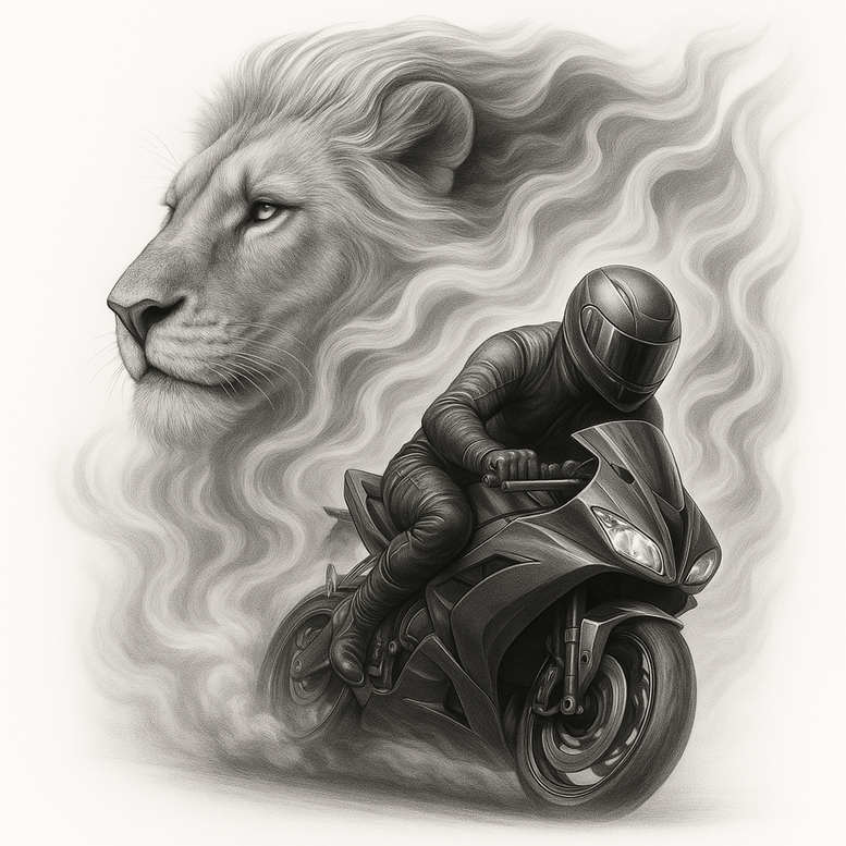 This AI-generated tattoo project presents a bold black and grey, realistic tattoo design that pairs a motorcycle rider on a sport bike with a lion’s head formed by flowing smoke. The composition emphasizes motion and power: the rider clamps the handlebars while the lion’s gaze meets the horizon, its mane dissolving into curling wisps that frame the bike and blur the boundary between man, machine, and smoke. Executed in smooth graphite shading and crisp edge work, the piece relies on graded value, subtle textures on leather, chrome highlights on the visor, and careful contouring of the tires to achieve a believable three-dimensional form. Symbolically, the image blends speed, control, and courage: the rider embodies determination and momentum, the lion stands for strength and leadership, and the smoke links both elements into a single cohesive narrative. The design reads as a versatile tattoo concept suitable for back, shoulder, or chest canvases, and can be adapted to different sizes or shifted toward a fine line or broader black and grey approach depending on placement. If a cover-up is needed, the dark shading and integrated negative-space lion head offer strong concealment while preserving a striking focal point. The artwork also accommodates stylistic variations, such as Japanese texture-inspired treatment, tribal linework, or a leaner realist approach depending on client preference; it remains anchored by black and grey tones, ink grading, and careful form. Ultimately, the design offers a compelling template for a powerful cover-up that preserves impact and storytelling.
