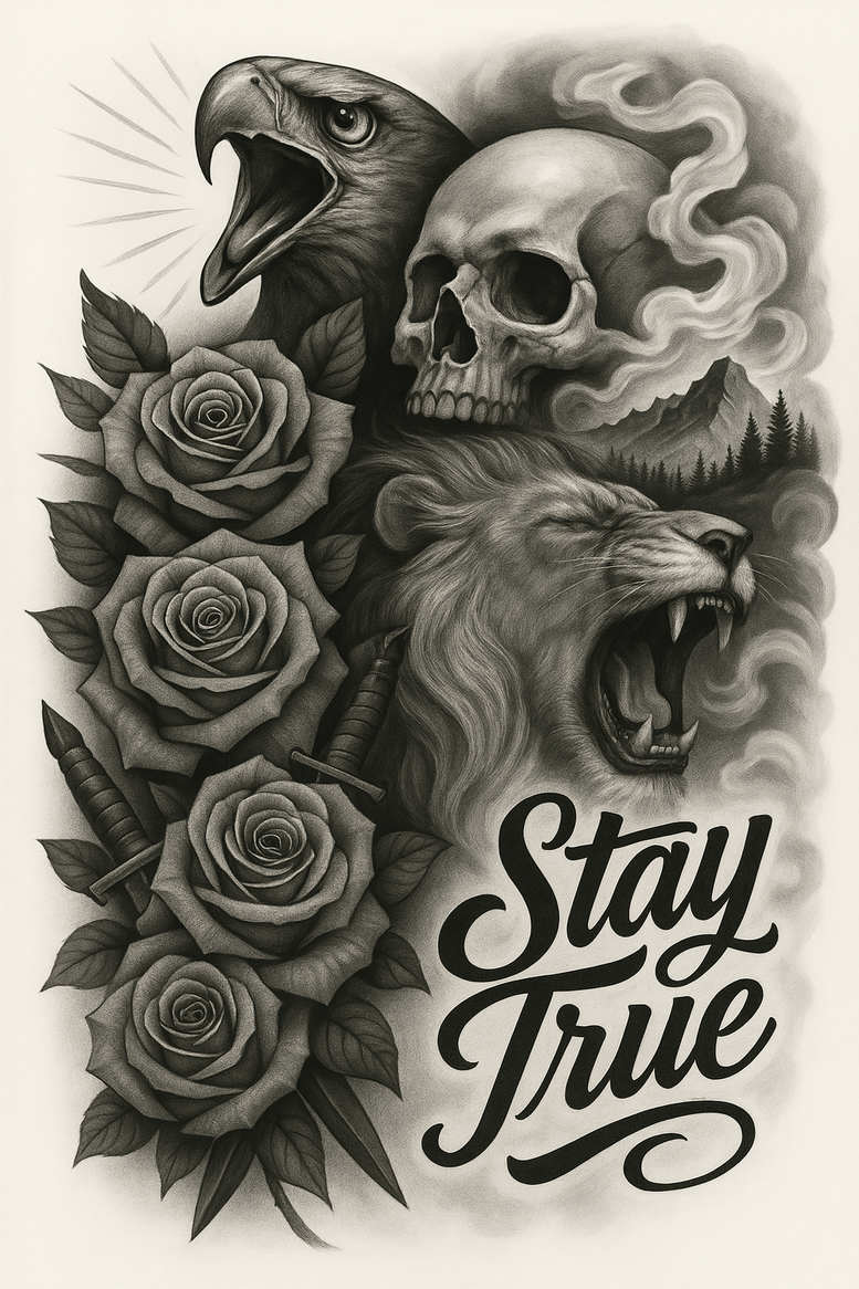 This is an AI-generated tattoo project rendered in black and grey with high-contrast realism, designed as a cover-up-ready body art concept. The composition centers on a trio of powerful symbols: an eagle head, a skull, and a roaring lion, arranged in a vertical cascade that anchors the upper torso and chest. Alongside them, a chain of roses runs along the left, their petals shaded with delicate feathering that mirrors the depth of the animals’ plumage and mane, creating a unified flow. Subtle daggers punctuate the design, and drifting wisps of smoke and a distant mountain range provide atmosphere and scale. A script banner bearing the motto Stay True threads through the lower right, offering a personal meaning that can be customized to the wearer. Tonal control is key: the piece relies on dense gray washes and fine line work to carve detail into whiskers, thorns, petal veins, and the textured fur, ensuring readability from a distance while rewarding close inspection. The overall arrangement aims for bold impact in large formats—back, chest, or sleeve—without sacrificing legibility, balance, or elegance. The rose motif connotes beauty, resilience, and renewal, while the skull and predator imagery nod to mortality, strength, and courage; together they form a narrative that invites interpretation and personalization, aligning with tattoo design traditions that prize meaningful tattoos and custom tattoo design. The black and grey palette emphasizes texture and form, matching the aesthetic of realistic tattooing and allowing smooth ink transitions across skin. As a contemporary AI-generated project, it demonstrates how modern tooling can produce complex compositions suitable for cover-ups, yet it remains adaptable: line weight, density of shading, and the motto can be tailored to suit individual body art goals, from rose tattoo design enthusiasts to fans of floral and fauna motifs and large-scale ink.