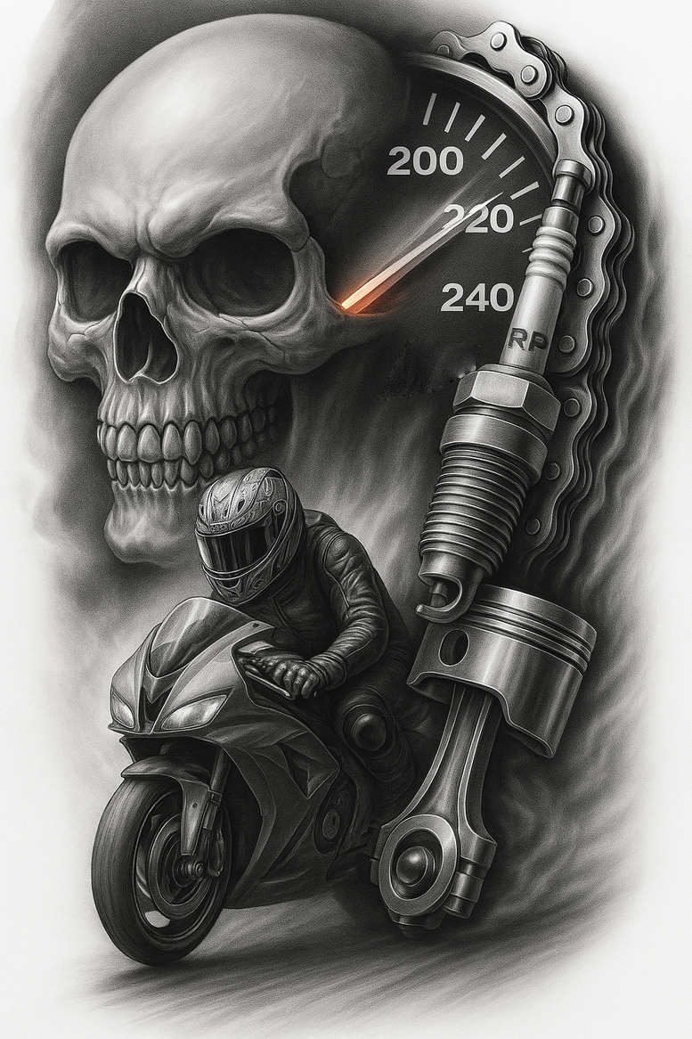 This AI-generated tattoo project offers a dark, cinematic study that pairs a colossal skull with a roaring motorcycle and exposed engine components in a refined black and grey palette. The composition places a dominant skull in the background, its hollow eye sockets framing a speeding rider and a high-performance machine whose piston, connecting rod, and spark plug form a looping backbone around the composition. The dial or gauge in the background adds a technical motif, suggesting momentum, pressure, and precision. The shading is carefully layered to reproduce subtle transitions from near-white highlights to deep graphite shadows, creating a sense of depth and tactile metal textures on the piston, clamp, and bike body. This is not mere iconography; it’s a narrative about mortality, speed, risk, and resilience—an archetypal confrontation with time that also functions as a guard against unwanted retouching, because the bold silhouette and dense shadows can seamlessly cover older ink where needed. The design is adaptable to larger canvases like the shoulder, back, or chest, while the black and grey tonality ensures a cohesive integration with other inked pieces. From a technique perspective, this tattoo design relies on crisp line work for edges, extensive cross-hatching for gradient shading, and careful geometry to render the mechanical details with realism. The result is a cohesive body art statement that resonates with fans of realistic tattoos, mechanical imagery, and meaningful tattoos. As a cover-up concept, it is particularly well-suited to conceal prior tattoos beneath a strong, high-contrast silhouette that preserves readability and aesthetic appeal. In the broader context of tattoo design trends, it aligns with the demand for custom tattoo design that blends symbolic meaning, technical execution, and striking visual impact. The work also nods to Japanese and Western tattoo sensibilities by balancing ceremonial weight with modern, machine-led energy, making it an ideal choice for those seeking a bold, impactful tattoo that remains wearable across contexts. This is an AI-generated tattoo project, intended to showcase a refined, realistic approach to black and grey ink and to illustrate how cover-ups can be crafted with careful composition and texture.