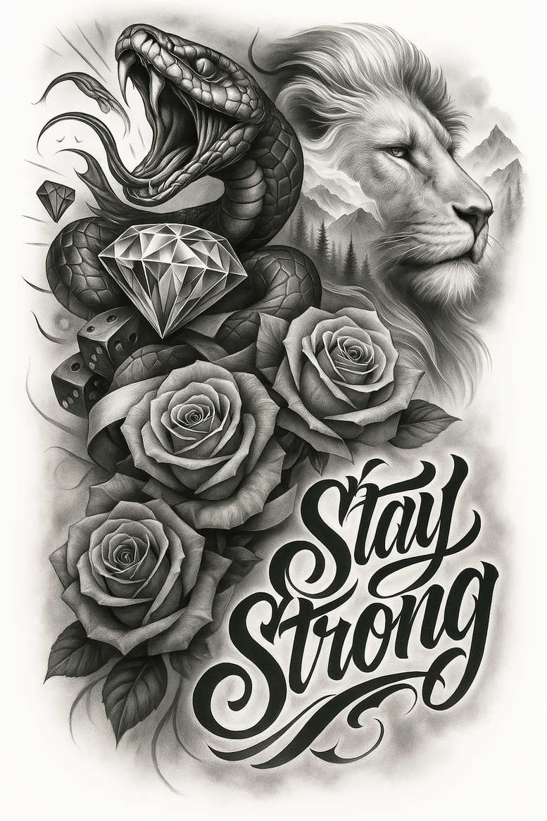 This black and grey tattoo design fuses a regal lion head with a coiled serpent, a bouquet of roses, a faceted diamond, and scattered dice, all anchored by the sweeping Stay Strong script. Rendered in a high-contrast, realism-inspired approach, the piece relies on nuanced gradations of shading to carve depth into fur, scales, petals, and facets, creating a dynamic reading from a distance and up close. The lion’s profile conveys courage and resilience, its mane built from soft transitions that contrast with the serpentine coil, which threads through the floral cluster to guide the eye toward the geometric gem and the lucky dice. The roses anchor the composition with classic symbolism of beauty, renewal, and endurance, while the diamond introduces a crystalline counterpoint—sharp, faceted, and luminous in grayscale. The dice provide a touch of chance and narrative tension, subtly suggesting the wearer’s personal story or beliefs. The bold script Stay Strong acts as an emotional anchor, its flourishes counterbalancing the dense imagery and offering a readable signature that enhances legibility on larger canvases. Technically, this piece demonstrates expert line work, crisp edge definition, and controlled gradient shading that holds up under aging and placement considerations across the body. The design employs fine line touches and smooth blending to achieve lifelike texture in fur and petal surfaces, while the geometric elements maintain a modern graphic rhythm, making it suitable for black and grey realism or a hybrid Japanese style tattoo approach. Because the image leans toward heavy contrast and intricate motifs, it presents a natural opportunity for a cover-up should the client wish to rework an existing tattoo without losing impact. As an AI-generated tattoo project, the concept illustrates how digital workflows translate into durable body art with scalable sizing and precise line weight, ensuring a bold statement on the chest, back, or arm. In terms of meaning, the composition weaves themes of strength, fate, beauty, and renewal, aligning with meaningful tattoos and rose tattoo design traditions, while the overall black and grey palette supports longevity of inked lines, a hallmark of realistic tattoo aesthetics, custom tattoo design possibilities, and the enduring appeal of flower tattoos and animal symbols in ink.