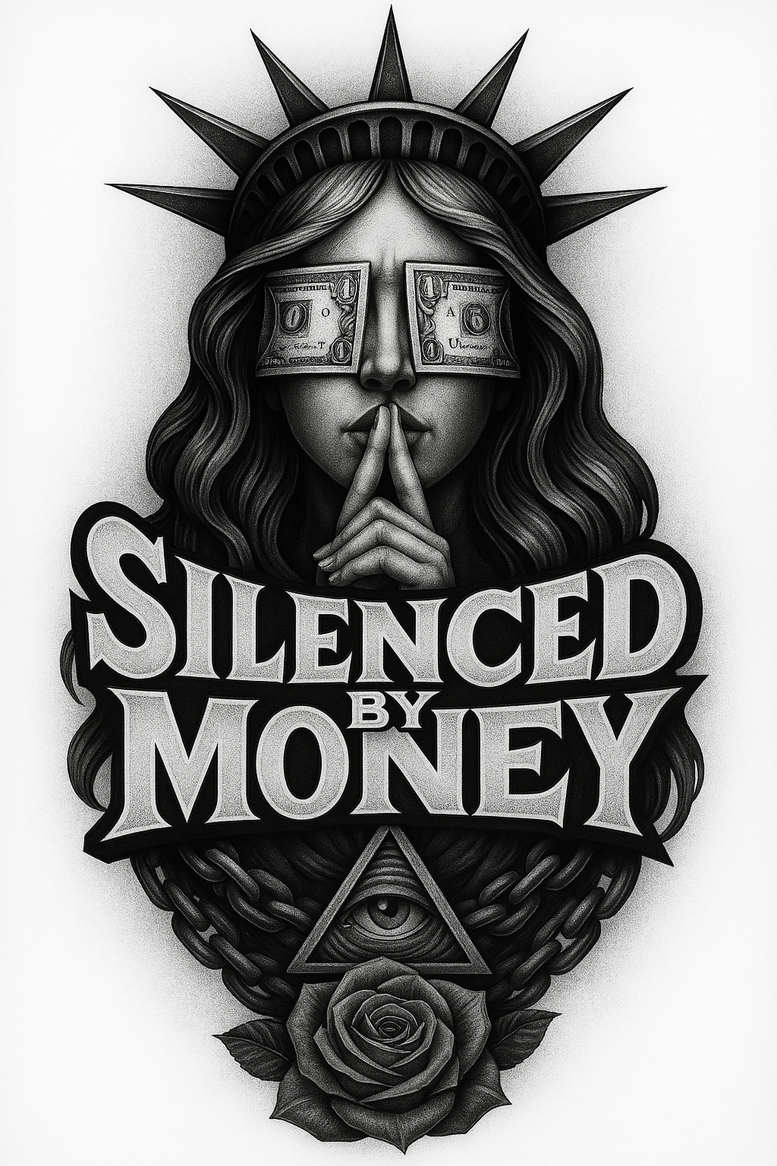 This monochrome tattoo composition presents a bold narrative in black and grey, combining social commentary with classic tattoo motifs. The central figure is a woman wearing the Statue of Liberty crown, her eyes replaced by dollar bills, a visual critique of financial power over freedom of speech. Her hands meet in a prayer-like gesture, suggesting contemplation or plea. Across the chest area runs a sweeping banner bearing the words Silenced by Money, executed in traditional lettering that anchors the piece in conventional tattoo design. Beneath, a triangular eye motif sits between heavy chains, leading the gaze toward a realistic rose at the base, which acts as a counterpoint of tenderness to the harsher symbols above. The illustration relies on precise line work and smooth grayscale shading to render hair strands, crown spikes, bill textures, and fabric folds with depth, while stippling adds atmosphere around the edges for subtle transitions. The overall composition forms a vertical axis that can adapt to the back, chest, or sleeve, with high contrast ensuring visibility in strong lighting. This design is well-suited for a cover-up, thanks to its dense shading and blocking shapes that can effectively conceal previous ink; the image also suits a variety of placements, from a bold statement piece to a smaller, impactful tattoo design. The work embraces a realistic black and grey aesthetic, employing modern ink techniques to achieve a cohesive, photorealistic effect, while remaining a strong example of meaningful tattoos and custom tattoo design. Note that this is an AI-generated tattoo project, illustrating how technology can inspire powerful body art and editorial-ready tattoo concepts.