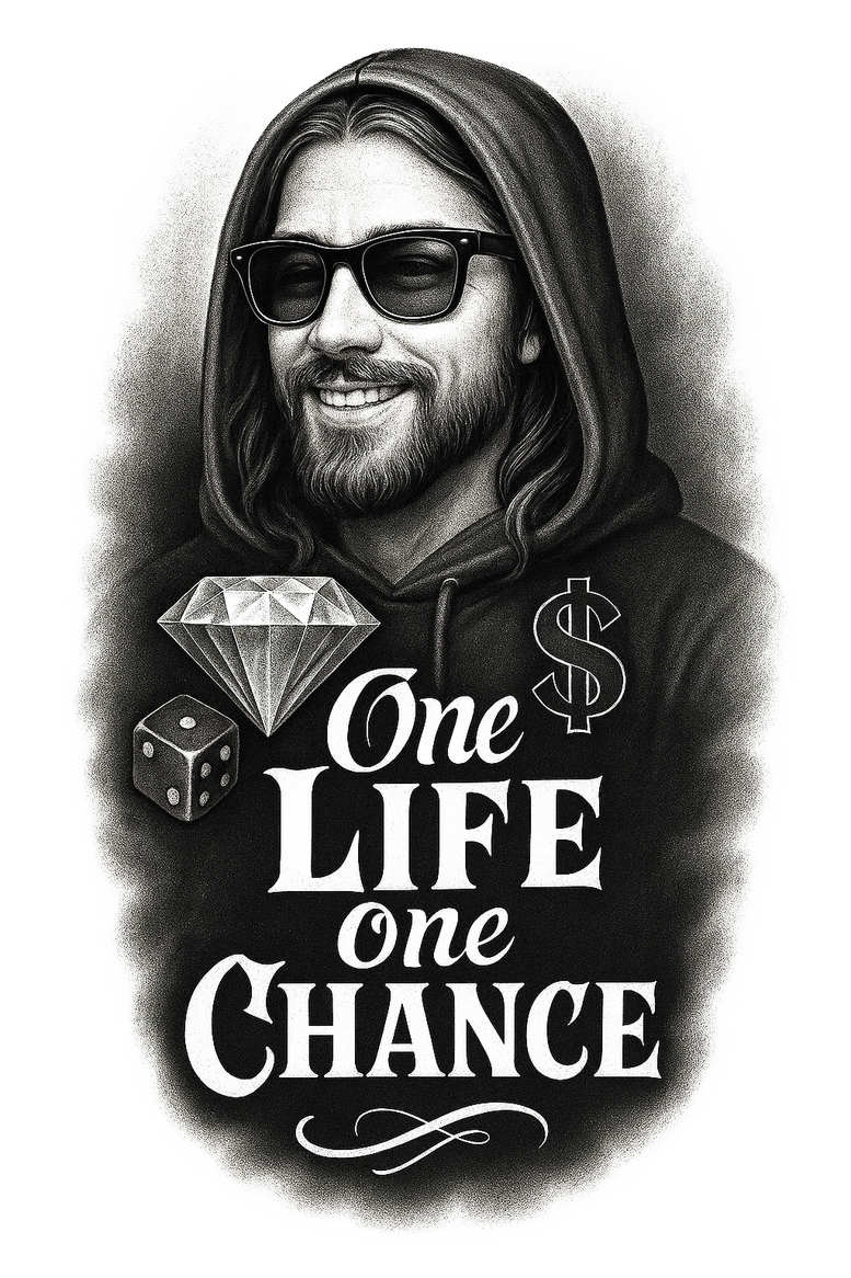 AI-generated tattoo project presented here as a black and grey, hyper-realistic concept designed for a cover-up. The composition centers on a portrait of a man in a hoodie and sunglasses, rendered with layered shading, soft transitions, and selective stippling to create three-dimensional skin texture and fabric depth. Across the chest rides bold script reading ‘One Life One Chance’, its typography echoing classic tattoo signage while remaining highly legible against the dark background. To balance the typography, a faceted diamond and a small die float to the left, introducing geometric, pattern-like elements that contrast with the organic portrait and text. The overall mood is confident and contemplative, marrying meaning with a graphic punch that works well on larger canvases like a chest panel or sleeve, yet can be adapted to smaller placements through line-detail optimization. Because the image leans heavily toward dark values, it presents an obvious cover-up potential, allowing it to conceal older ink while delivering a modern, story-driven tattoo design. The design leans into realistic black and grey shading, with careful gradient work that preserves subtle skin tone while maintaining strong contrast for the letters and diamonds. Techniques such as smooth blade transitions, crisp edges on the lettering, and measured stippling around the periphery ensure durability and longevity of the tattoo. The concept is deliberately flexible, suitable for a variety of placements and styles—ranging from Japanese-inspired tributes to contemporary noir realism—and invites tattoo artists to tailor the line weight, curvature, and spacing to suit individual anatomy and personal symbolism. As an AI-generated tattoo project, it demonstrates how technology can yield a robust foundation for a custom tattoo design, which clients and artists can collaboratively refine into a unique body art piece that carries real meaning.