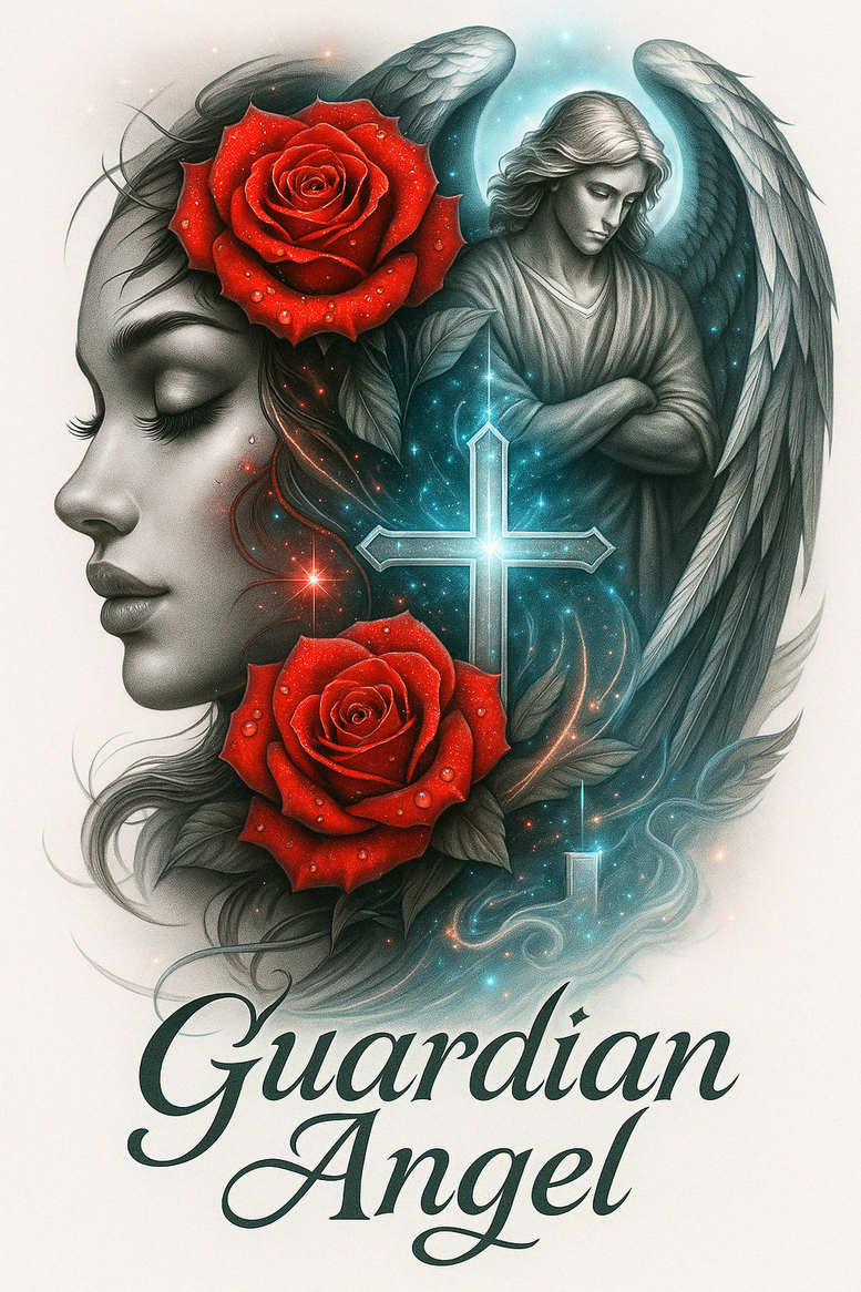 Presented as an AI-generated tattoo project, Guardian Angel blends a poised grayscale portrait with bold color accents and symbolic motifs to create a versatile design suitable for a range of placements. The central image is a side-profile of a woman rendered in black-and-grey shading, its contours softened by nuanced transitions that mimic pencil on skin. Two crimson roses anchor the composition—one near the crown and another near the base—providing vibrant contrast and evoking themes of love, memory, and transformation. A serene angel figure with expansive wings loops to the right, bathed in a cool, star-dusted blue aura that frames a luminous cross at the heart of the scene. The cross itself is drawn with crisp edges and a neon-like glow, suggesting guidance and faith as a beacon within the body art. Surrounding elements ripple with wisps and scattered specks, lending a celestial atmosphere that remains legible as a tattoo when scaled. Although the piece leans toward realism, it embraces a modern, graphic edge by pairing grayscale portraiture with selectively saturated color—red roses, blue glow—and a flowing script-like typography suggested by the hanging text “Guardian Angel” at the bottom of the artwork. The technique relies on careful gradient shading, fine line accents on petals and facial features, and controlled highlights that enhance depth without compromising longevity in ink. For clients seeking meaningful tattoos, this concept delivers a timeless narrative: protection, memory, and faith embodied in a single composition that can be adapted from subtle small tattoos to large back pieces. As an AI-generated tattoo project, it demonstrates how digital concept art can translate into practical tattoo design, offering a high-contrast silhouette for longevity and a balanced color palette that keeps key motifs recognizable over time. The design supports a range of skin tones and placement options, inviting adaptation into Japanese-style tattoo-inspired panels or a more traditional black-and-grey approach, while maintaining a contemporary, cinematic feel that resonates with modern body art and ink enthusiasts.