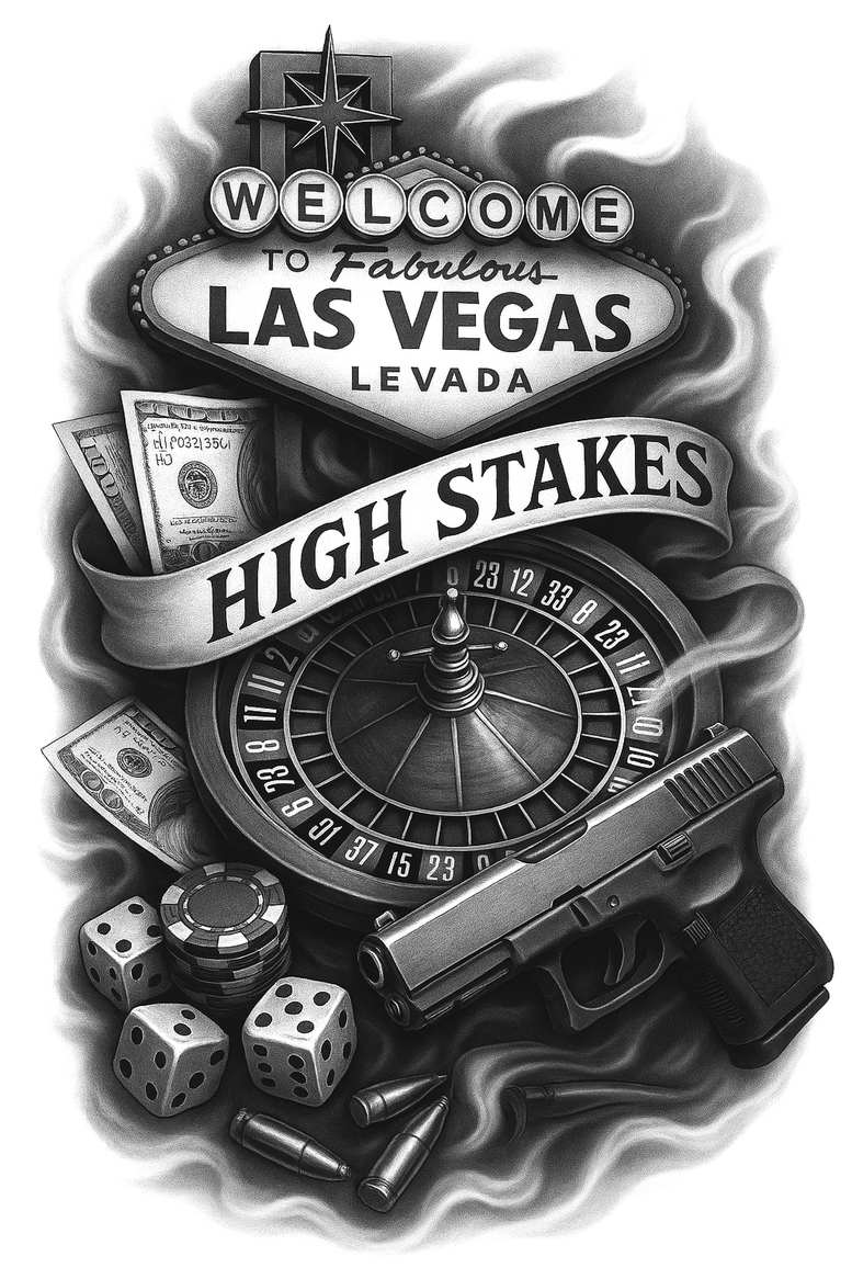 These AI-generated tattoo projects present a bold black-and-grey composition inspired by Las Vegas nightlife and the perilous thrill of betting. The central motif is a richly shaded roulette wheel, its spokes and rim carved with realism to convey depth on the skin. A sweeping banner with HIGH STAKES arcs across the design, tying in piles of money, scattered chips, and a gun resting at the lower edge, with bullets and a lone die completing the casino tableau. Wisps of smoke curl around the imagery, softening transitions and helping to integrate potential cover-up ink into a single cohesive body of work. The Las Vegas sign emerges near the top, reinforcing the theme while keeping the focal elements legible for tattoo readability. The overall layout is dense and high-contrast, designed to conceal existing ink through deliberate black shading, making it a dependable cover-up project for older tattoos. Technically, the piece leans toward black-and-grey realism, using fine line work for precision in the wheel, banner, and firearm details, while gradual shading creates smooth blends between components. Symbolically, the imagery plays on risk, luck, and the seduction of high-stake choices, with the gun and bullets injecting tension and narrative gravitas. These AI-generated tattoo projects are crafted to push bold storytelling in body art, with versatility for placement on forearm, calf, or back, and compatibility with additional tattoos or existing artwork. The moody palette ensures readability when expanded or paired with other motifs, and the pattern-like arrangement of the wheel, chips, and dice establishes a rhythmic, cohesive flow across the composition. In sum, this black-and-grey tattoo design offers a dramatic, meaningful concept that doubles as an effective cover-up solution while inviting refinements in line work and texture for a custom tattoo design.