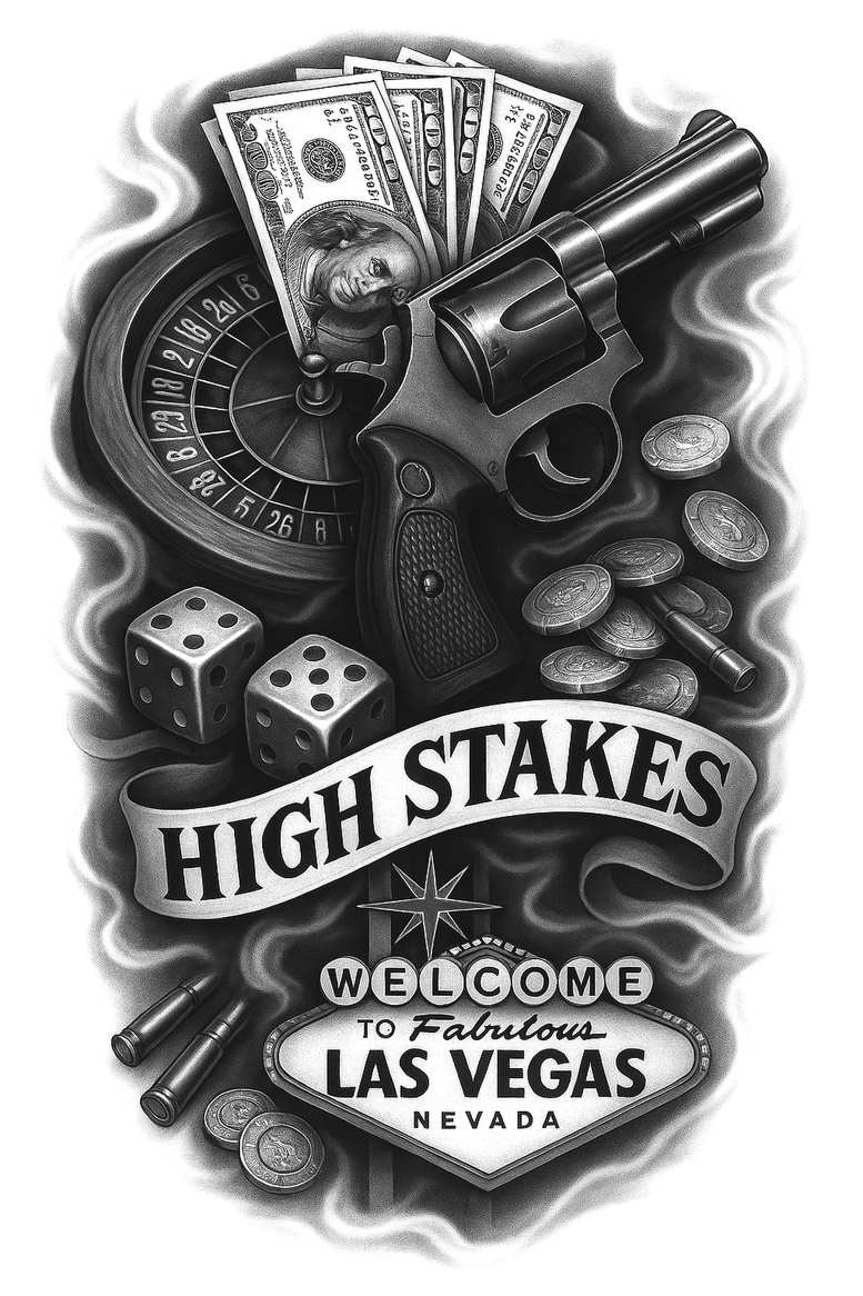 This AI-generated tattoo project explores a high-stakes gambling motif rendered in black and grey realism. The composition centers on a detailed revolver, whose silhouette anchors a bank of visual cues of risk and fortune: stacks of cash, scattered coins, and a pair of dice in mid-tumble. A roulette wheel peeks from the left edge, while the iconic Las Vegas sign and a bold High Stakes banner ground the scene in casino lore. The grayscale shading moves from sharp, hard-edged highlights to smooth, velvety shadows, giving tactile depth to metal, fabric, and paper; the gun’s cylindrical chambers reflect light with meticulous cross-hatching, the bills roll into soft folds, and the coins glint with metallic speculars. The design reads as a cohesive tattoo concept that can scale from a small, dramatic piece to a full-coverage back or chest composition; its dark foundation and strong contrast make it particularly suitable for cover-up work, allowing older tattoos to be concealed beneath the new image. The symbolism is direct: risk and reward, fate and fortune, the lure of gambling as both temptation and danger. The Las Vegas signage situates the motif in a recognizable urban mythos, while the banner’s sweeping curve guides the eye through the narrative. This tattoo design embraces grayscale ink and bold outlines to ensure legibility on skin, but it also leaves room for stylistic twists—fine-line detailing for texture, a tribal or Japanese influence as an overlay, or a more realistic rendering depending on client preference. In addition to its aesthetic impact, the piece functions as a meaningful tattoo design for those seeking a statement about chance, money, and independence, and as an adaptable project that can be tailored for small tattoos or expanded into larger, cover-up friendly body art. As an AI-generated tattoo project, it exemplifies how machine-assisted artistry can produce compelling, market-ready concepts suitable for ink, body art, and the world of tattoos.