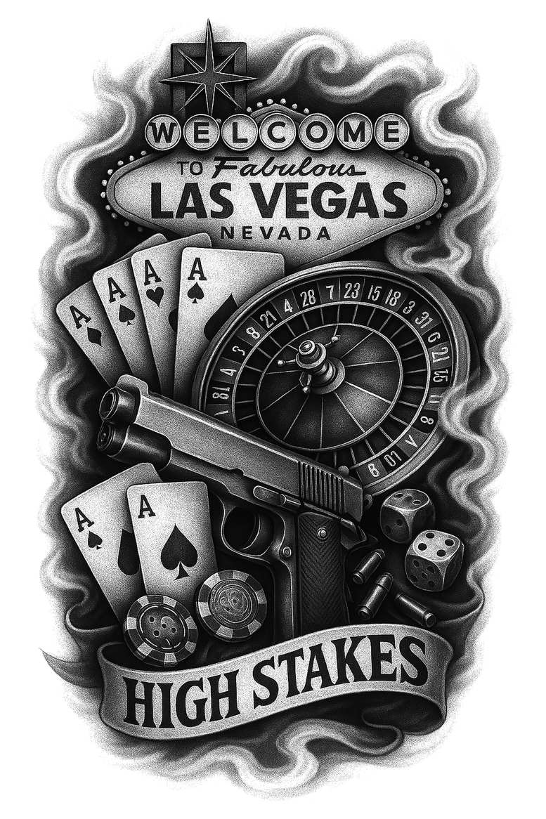AI-generated tattoo project presenting a black and grey homage to classic Las Vegas iconography. The design centers on a heavy pistol laid over a roulette wheel, with a fan of aces and scattered dice and chips, all framed by a smoke-like aura that swirls behind a bold HIGH STAKES ribbon. Executed in monochrome tonal gradations, the piece emphasizes high contrast, crisp linework, and meticulous shading to create depth and realism on skin. The gun is rendered with precise mechanical details, the roulette wheel shows numbered pockets and a central spindle, while the cards reveal strong silhouettes of aces—spades, clubs, diamonds, and hearts—arranged to suggest a gambler’s luck and risk. The chips are stacked near the base, adding a tactile sense of weight to the composition, and the banner arcs across the bottom, unifying the elements into a single tattoo design. This concept blends imagery from gambling culture with tattoo-hard lines, giving it the feel of a timeless body art piece that can suit a bold shoulder, chest, or back canvas. The use of black and grey ink, along with soft grey washes, produces a dynamic range of tones that read clearly from distance and up close, making the motifs legible even at smaller scales. Because of the density and darkness of the imagery, the composition is well suited for cover-up applications, allowing earlier tattoos to be concealed beneath the new design. If a client seeks a strong, statement-making tattoo design with an aura of risk and elite casino glamour, this piece offers a compelling route. AI origin is acknowledged here as an AI-generated tattoo project intended to spark discussion about modern approaches to custom tattoo design, while preserving the tactile feel of traditional tattooing and the narrative resonance of high-stakes symbolism—an ideal fit for those seeking meaningful tattoos, black and grey realism, and bold body art.