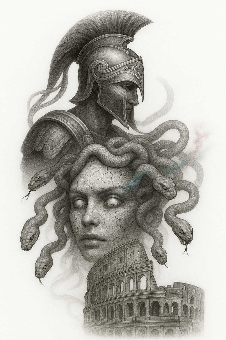 This AI-generated tattoo project presents a dramatic grayscale composition that fuses myth with antiquity: a helmeted Spartan warrior gazes over a Medusa head whose cracked stone skin bleeds into shadow, while serpents coil through the hair and a plume. The lower portion grounds the piece with a detailed rendering of the Colosseum, arches spiraling along the base as if recalling a distant crowd. Rendered in black and grey with careful shading, the artwork relies on subtle textures—stone fracture, scaled serpents, and polished metal—to create a cohesive tattoo design that reads as a single narrative. The serpents’ sinuous lines provide motion against the stoic faces of the helmeted figure and the Medusa, inviting a meditation on protection, danger, and metamorphosis. From a technical standpoint, the piece uses a restrained grayscale palette, with fine line work and smooth gradient shading to achieve depth and realism, aligning with fine line tattoo and realistic tattoo sensibilities. The symbolism blends classical myth with architectural memory: Medusa as warning or empowerment, the Colosseum as a stage for destiny, and the helmet as a shield for the wearer. This approach makes the design versatile for varied placements—forearm, shoulder, back, or chest—while remaining legible in both small tattoos and larger body art projects. For enthusiasts of meaningful tattoos, this composition delivers strong visual impact and timeless aura, with opportunities to tailor line weight, texture, and contrast in a custom tattoo design session. As an AI-origin concept, this project demonstrates how imagined narratives can translate into ink-ready imagery, offering a toolkit for tattoo studios seeking distinctive, publication-friendly content. The piece foregrounds black and grey tones, embraces pattern elements in the serpentine details, and uses a classic myth-meets-architecture motif that is well suited for those seeking a bold, statement tattoo with timeless resonance. Collectors and artists may appreciate how the design balances negative space, tonal gradation, and detailed textures to reproduce convincingly in ink on diverse skin tones.