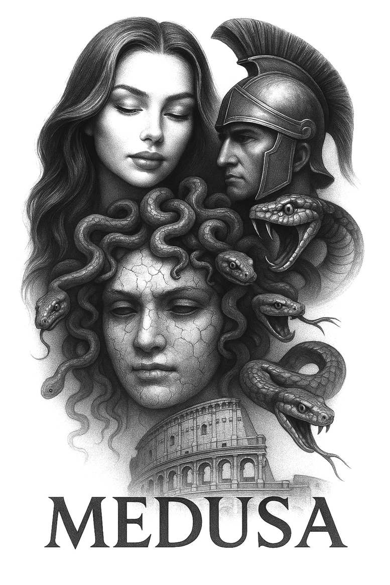 AI-generated tattoo project presents a dramatic black-and-grey composition centered on Medusa. Medusa’s face is rendered with a contemplative expression, a cracked stone texture curling across her cheeks to evoke myth and resilience. From her head, serpents coil in fluid motion, their scales detailed with careful shading to create depth. To the right, a helmeted Roman warrior’s profile provides contrast, hinting at mythic power. At the base, the Colosseum arches anchor the scene in classical history. The design uses fine-line shading and smooth transitions to achieve a highly realistic tattoo look suited for a large canvas such as a back, sleeve, or chest. The interplay of beauty and danger—soft features against twisted serpents—forms a narrative about transformation and defiance. The cracked skin on Medusa adds a supernatural dimension, reinforcing themes of change and renewal. This tattoo concept offers focal points that can be emphasized or scaled: Medusa’s face, the serpents, the helmeted figure, and the Colosseum, each adaptable to fit the chosen area while preserving legibility of fine-line details. The piece demonstrates how a cohesive black-and-grey palette can yield a striking, realistic result in a multi-element composition. For cover-up considerations, dense shading and strong silhouettes can mask prior ink, with serpentine elements offering natural camouflage. This project invites tattoo enthusiasts seeking meaningful tattoos, custom tattoo design, and bold mythic imagery, and it resonates with fans of fine line, black-and-grey, Japanese-style, and realistic tattoo traditions. This is an AI-generated tattoo project, intended to illustrate digital concept feasibility and to guide collaboration with an artist toward personalized placement and scale.