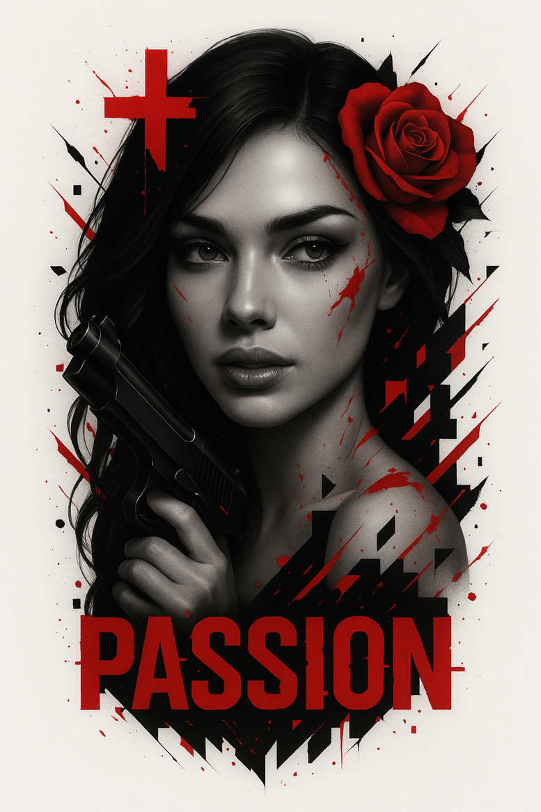 AI-generated tattoo project presented as a cohesive study in contrast, this black-and-grey portrait merges a calm cinematic face with a bold handgun and a crimson rose, all shaped by splatters and fragmented geometric motifs that push the design toward a modern pattern-driven aesthetic. The composition centers on a realistic grayscale rendering of a woman, with meticulous shading, soft transitions, and fine-line detailing that yield lifelike depth while allowing the red accents to strike the eye, establishing a striking tattoo design aesthetic. The rose stands for passion and romance, counterpointed by the weapon to evoke tension between allure and danger; the red splashes and triangular shards create movement across skin, guiding the eye from the rose crown through the cheek and down to the bold PASSION typography at the bottom. This piece is engineered as a versatile concept: the grayscale palette ensures elegance in black and grey ink, while the red highlights provide a dramatic color pop that remains suitable for both small tattoos and larger sleeves. The geometric fragments function as a pattern that can be incorporated into sleeve, chest, or back work, and the negative space and overlapping elements offer a forgiving canvas for a cover-up if darker layers exist beneath. For collectors seeking meaningful tattoos, this design delivers a potent narrative about love, risk, and identity, and it serves as a customizable tattoo design with potential for Japanese-inspired line work, tribal influences, or ultra-fine line detailing. The balance of soft portraiture and sharp edges makes it adaptable to various placements, from wrist to shoulder blade, while maintaining a bold statement. In short, this is more than an image; it is an AI-generated tattoo concept that translates into a refined, high-contrast piece—embodying passion and peril and aligning with the contemporary tattoo aesthetics of black and grey realism, ink density, and patterned geometry.