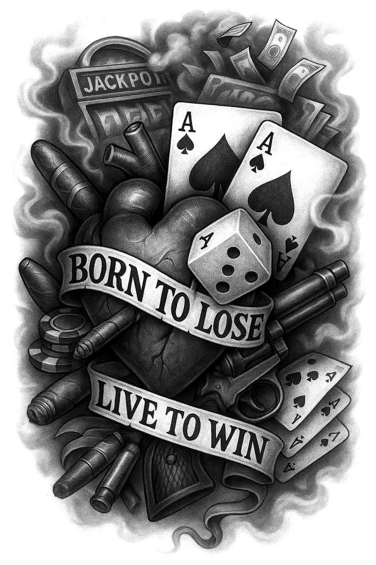 AI-generated tattoo project presented as a dark, hyper-detailed composition centered on a stylized heart, around which gambling iconography is arranged in a tight, high-contrast grayscale palette. Playing cards, notably the ace of spades, rise above the heart; a pair of dice clatter near the lower edge; poker chips stack in the background; a belt-like banner wraps across the midsection with the bold phrases “Born To Lose” and “Live To Win.” Bullets and shadowed forms hint at danger, risk, and permanence, while smoke-like wisps and soft shading provide a cohesive atmosphere that reads as a single, powerful tattoo design. The piece is executed in black and grey with careful gradation, feathered lines for fine detail, and deliberate negative space to preserve clarity on the skin, making it suitable as a substantial arm or torso work. The composition balances mass and light, guiding the eye from the heart outward to the cards and dice, then back to the banner, so that the viewer reads a narrative about choice, fate, and the stakes of life. In technique terms, the design relies on layered shading, cross-hatching, and stippling to achieve depth, a look often associated with realistic tattoo and black and grey work. Symbolically, the heart stands for passion and risk, the cards and dice symbolize chance, while the banners proclaim a creed of risk versus reward—an ideal motif for meaningful tattoos or cover-up projects. As an AI-generated tattoo project, it demonstrates contemporary design language that can be adapted to different bodies, sizes, and skin tones, and because the overall palette stays deep and dramatic, it is especially effective as a cover-up that can mask older ink while delivering a bold new statement.