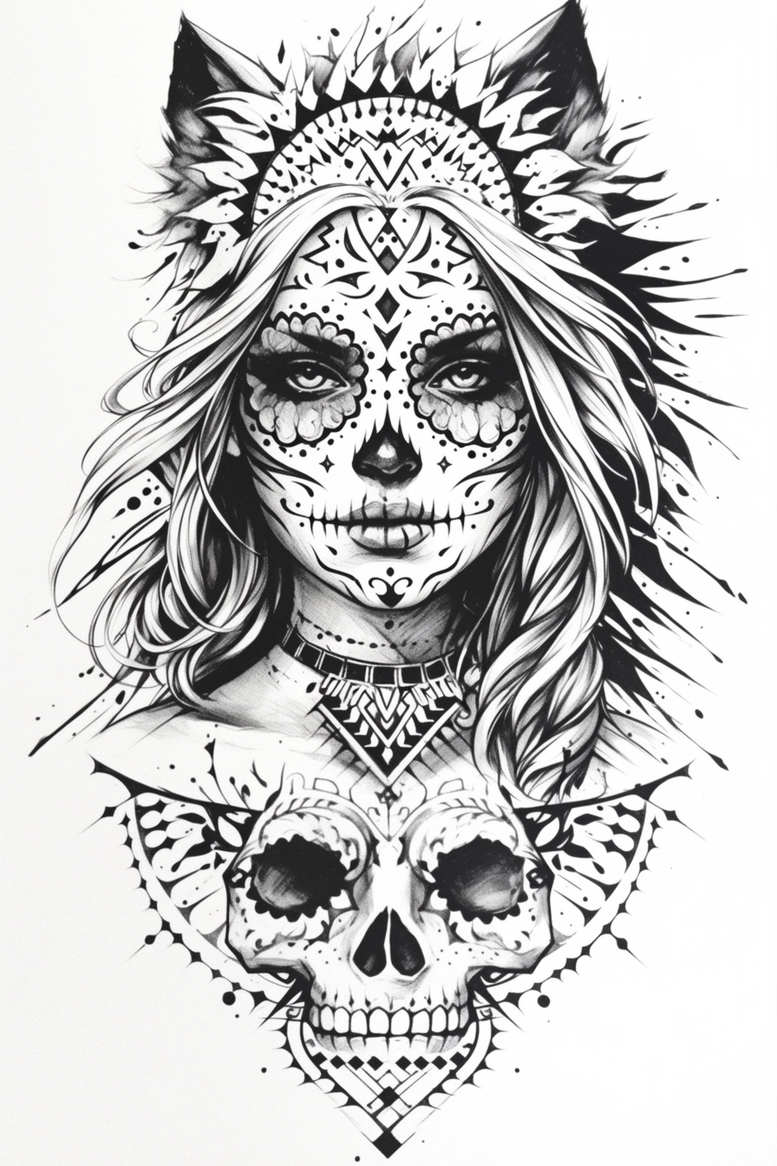 This AI-generated tattoo project presents a bold black-and-grey sugar skull portrait fused with a feminine visage, where Dia de los Muertos symbolism meets contemporary fine line technique. The central image is a woman’s face outlined in crisp lines, with sugar skull motifs framing the eyes and a delicate row of teeth spanning the lips. An ornate headpiece crowns the brow, built from geometric shapes and feather-like motifs that radiate outward, while the hair flows in loose, wind-swept strands that add movement and depth. Beneath the face sits a large, intricately patterned skull motif that anchors the composition, connected by a choker-like necklace rendered in sharp geometric angles. The piece blends contrast-rich shading with negative space, creating a tattoo design that reads as both delicate and graphic, suitable for a high-visibility placement or as a cover-up solution for existing ink. The symbolism juxtaposes life and death, beauty and mortality, inviting the wearer to tell a personal story through a single image that can be scaled from small to medium sizes as a meaningful tattoo. The use of black ink on light skin with fine line work and dot-work detailing yields a refined, realistic appearance while preserving bold readability from a distance. The approach aligns with modern trends in black and grey tattooing, is well-suited for a custom tattoo design, and can be adapted to different skin tones. In the larger context of tattoo art, it stands as a versatile piece that can be extended with additional elements, such as lotus flowers or infinity symbols, should the client desire more narrative depth. Given its strong dark shadows and dense line work, this composition is particularly effective as a cover-up design, visually concealing prior marks beneath a new portrait while offering a striking, fresh interpretation. This description uses terms commonly found in tattoo magazines to discuss technique, symbolism, and marketability. Overall, the piece demonstrates how a sugar skull motif can be integrated into a portrait with a headdress to create a cohesive body art statement.