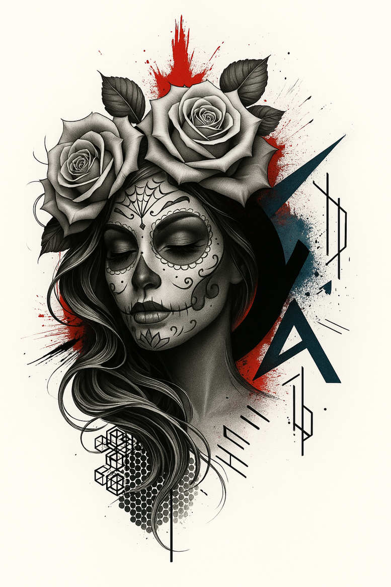 This AI-generated tattoo project concept presents a moody grayscale portrait of a woman crowned by two roses, with sugar skull filigree tracing the face. The shading is smooth and textural, rendered in black and grey to emphasize depth and mood, while red splashes and teal geometric shards provide punctuated contrast without overpowering the grayscale core. The roses anchor the composition, their petals carved with delicate linework to convey softness against the sharp geometry of hexagons and linear glyphs that rise behind the figure. The facial motifs draw from sugar skull traditions, pairing beauty with mortality to evoke memory, legacy, and transformation—an ideal pairing for meaningful tattoos seeking a narrative. The flowing hair weaves through the design, integrating dotwork and fine-line curves that promote a cohesive, wearable silhouette suitable for larger canvases such as the shoulder or back, as well as a bold upper-arm piece. Because of its dense black ink and careful shading, this concept is especially well-suited as a cover-up on dark existing tattoos, delivering clarity and depth where previous work may reside. Presented as an AI-generated tattoo project concept, it demonstrates how rose symbolism, skull-inspired linework, and geometric accents can be harmonized into a contemporary tattoo design that remains legible over time, while incorporating elements of Japanese-inspired precision and modern black-and-grey realism. The design is adaptable as a custom tattoo design for those seeking a striking, meaningful tattoo that blends floral beauty with bold linework and ink geometry.