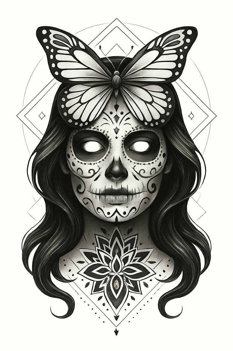 This is an AI-generated tattoo project, designed to explore a sugar skull motif reimagined in black and grey realism. A delicate butterfly sits atop the head, its wings spread in a grayscale gradient that contrasts with the stark lines of the sugar skull’s ornate face. The portrait is framed by flowing hair that frames the central visage, while a geometric mandala blooms on the throat and chest area, echoing symmetry and balance. Behind the figure, a ring of circles and angular diamonds provides a subtle halo that anchors the composition. The linework uses fine, crisp contours paired with smooth shading to achieve depth and a sense of tattoo-grade realism. The sugar skull’s decorative lashes, dots, and filigree evoke Day of the Dead traditions while the butterfly symbolizes transformation and renewal, creating a meaning-rich design suitable for a larger canvas such as the chest or back. The mandala motif reinforces focus and resilience, and the overall piece blends elements of Japanese style tattoo influence with Western ornamental patterns, producing a unique fusion that reads well in black and grey ink. The artwork showcases how a single image can carry multiple symbols—mortality, rebirth, beauty, and order—while remaining versatile for a custom tattoo design. Whether used as a centerpiece or as part of a larger sleeve, the composition demonstrates how fine line tattoo technique and realistic shading can deliver a striking, timeless body art piece. It’s an AI-generated tattoo project aimed at pushing the boundaries of traditional sugar skull iconography into contemporary, ethereal territory.