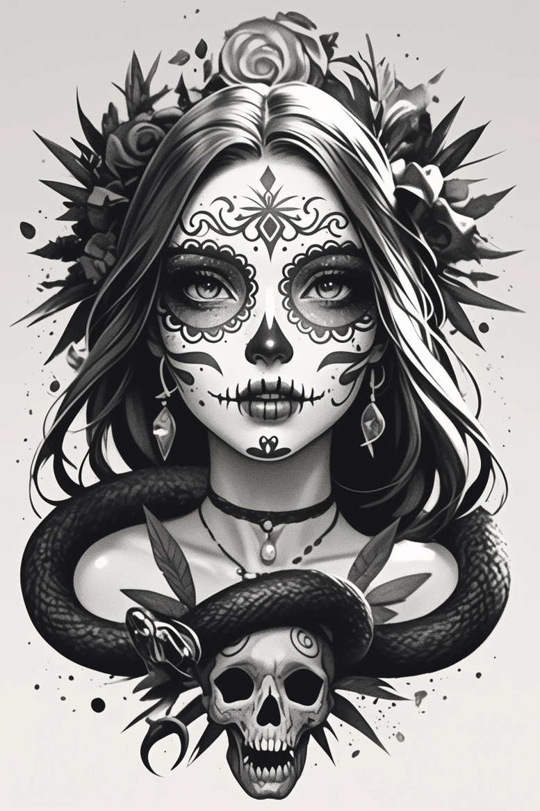 AI-generated tattoo project presents a dramatic black-and-grey, fine-line portrait that blends Dia de los Muertos sugar skull imagery with symbols of rebirth. The central figure is a woman whose face is sculpted with ornate lace-like sugar skull patterns, the eyes rendered with soft shading that invites close inspection. A sinuous snake coils around the neck, its scales suggested by delicate line work, while a skull motif anchors the lower portion of the composition. A crown of roses braids through the hair, introducing natural contrast and organic movement to the piece, and a pendant necklace with a subtle gem adds a touch of jewelry-inspired realism. The design relies on precise line weight, smooth gradients, and restrained stippling to achieve depth within a cohesive black-and-grey palette, making it suitable for a large back piece or chest panel, and adaptable for smaller placements through careful scaling. Symbolically, the roses signify beauty and resilience, the skull represents mortality, and the snake embodies rebirth and protection; together they convey a meaningful tattoo narrative that fits within the broader categories of rose tattoo design, fine line tattoo, and Japanese-inspired linework. The composition also nods to realistic tattoo sensibilities, with attention to anatomy and shading that preserves legibility as it ages. While intensely dark, the work is designed with cover-up feasibility in mind, as the dark shadows can obscure older ink when applied by a skilled artist. This approach aligns with the growing demand for meaningful tattoos that fuse traditional motifs with contemporary execution, suitable for ink lovers seeking a bold statement without sacrificing clarity in black and grey. The final piece invites customization, allowing curating elements such as infinity or lotus motifs to emphasize balance, and positions itself as a versatile template for custom tattoo design that preserves the essence of the image across body art applications. Technically, the piece relies on clean vector-like outlines combined with subtle brush shading to mimic real skin upon healing, enabling a faithful transfer from screen to skin. The expression in the eyes is designed to hold emotion, while the snake’s curvature guides the viewer’s gaze around the design, creating a natural flow that works well on the ribcage, shoulder blade, or arm. For collectors seeking a timeless, meaningful tattoo, this concept offers a strong foundation for collaboration with a tattoo artist; it invites personalized adjustments such as scale, orientation, or additional symbolic inscriptions to reflect the wearer’s journey. Because it is AI-generated, it benefits from rapid iteration and consistent motif integration, while still requiring expert inking to realize the textures of skin and fabric, the glint of gemstone, and the sheen of metal. The result is a cohesive tattoo design that communicates strength, mystery, and elegance, capable of becoming a signature piece in any collection of small tattoos or larger bodysuit motifs. In short, this black and grey sugar skull portrait with snake and roses is a modern reinterpretation of classic iconography, combining flower tattoos with Dia de los Muertos artistry to achieve a timeless, impactful body art statement.