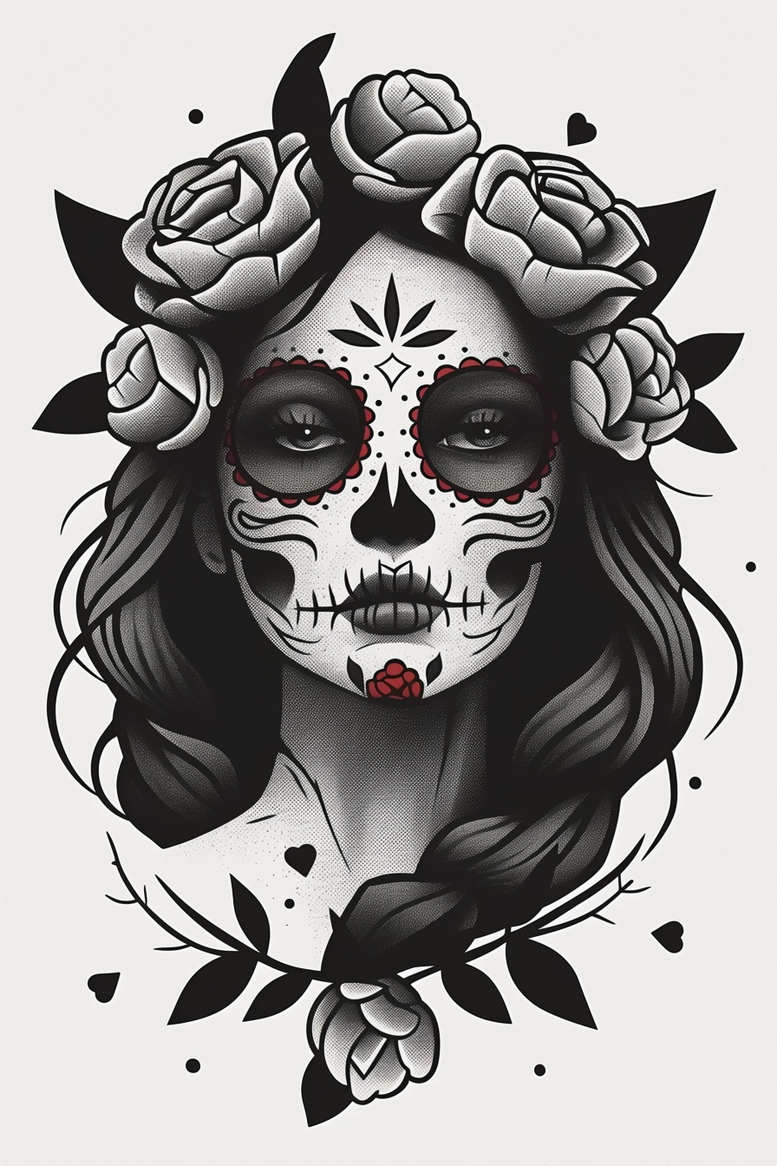 This AI-generated tattoo project features a bold sugar skull portrait framed by a crown of roses. Rendered in high-contrast black and grey, the linework is crisp and the shading rich, blending fine line details with stippled dots to create depth. Rooted in Dia de los Muertos imagery, the design translates the calavera motif into a contemporary tattoo design suitable as a standalone piece or as a cover-up. The central skull shows hollow eye sockets edged with scalloped rings, a dark nasal cavity, and a stitched mouth, while a braid flows from the side and a floral crown sits atop the head. Surrounding leaves and small decorative elements enhance the silhouette, guiding the eye toward the face and giving the composition movement. The overall mood is bold yet elegant, with dense blacks providing strong contrast that can effectively conceal previous tattoos, making it a practical cover-up option. If color is added later, restrained red accents could enliven the eye area, but the black and grey version remains striking on its own. The design emphasizes balance between intimate detail and broad shape, enabling both small tattoo designs and larger body art. As an AI-generated tattoo project, it demonstrates how digital concepts translate into a stencil-ready concept for ink. The visible elements—face, rose, leaf, hair—carry symbolic weight: the skull hints at mortality, the roses eternal beauty, and the leafy frame the cycle of life. Artists can tailor line thickness and shading to each client, ensuring the piece fits the body’s contours and healing dynamics. In practice, this design can scale from a small forearm piece to a larger chest panel, with the cover-up aspect preserved by layering black behind the linework.