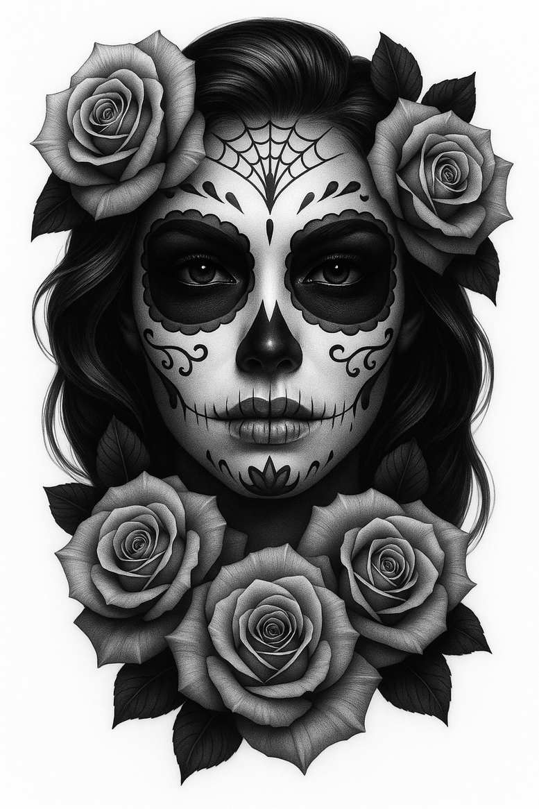 These are AI-generated tattoo projects exploring a bold sugar skull portrait intertwined with roses, rendered in black and grey with meticulous shading. The central visage is a female face styled as a calavera, its eye sockets darkened and outlined with lace-like scallops, the nose hollowed, and a stitched smile that echoes Día de los Muertos symbolism. Surrounding the face are large roses and accompanying leaves that weave into the jaw and temples, forming a cohesive frame that reads as a single tattoo design. The piece employs smooth gradients and fine line detailing to achieve a realistic yet ornamental look, suitable for placements from the inner forearm to the shoulder or collarbone; the high-contrast grayscale palette ensures legibility as a standalone piece or a larger composition. Notable motifs include the spiderweb forehead motif, symmetrical scrolls on the cheeks, and a floral cusp at the chin, all executed with precision to preserve clarity over time. For meaningful tattoos, this design fuses Mexican folk art with contemporary realism, offering a narrative of transformation and memory. Roses symbolize love and remembrance, while the skull acknowledges mortality and resilience; together they form a decorative yet symbolic design. This is a prime candidate for a cover-up due to its dense shading and dark accents, and the bold black outlines will help obscure prior marks if used as a cover-up ink project. These are AI-generated tattoo projects, crafted to showcase a dramatic sugar skull aesthetic in a refined black and grey spectrum, with the roses providing contrast and balance. In practical application, a skilled tattoo artist would translate the grayscale shading into smooth, lasting gradients, preserving intricate lace edges around the eye sockets and the delicate linework of the forehead web. The resulting tattoo design honors tradition while embracing modern realism, aligning with trends in rose tattoo design, calavera art, and fine line tattoo detail; suitable for small tattoos or extended compositions for chest, back, or arm canvases.