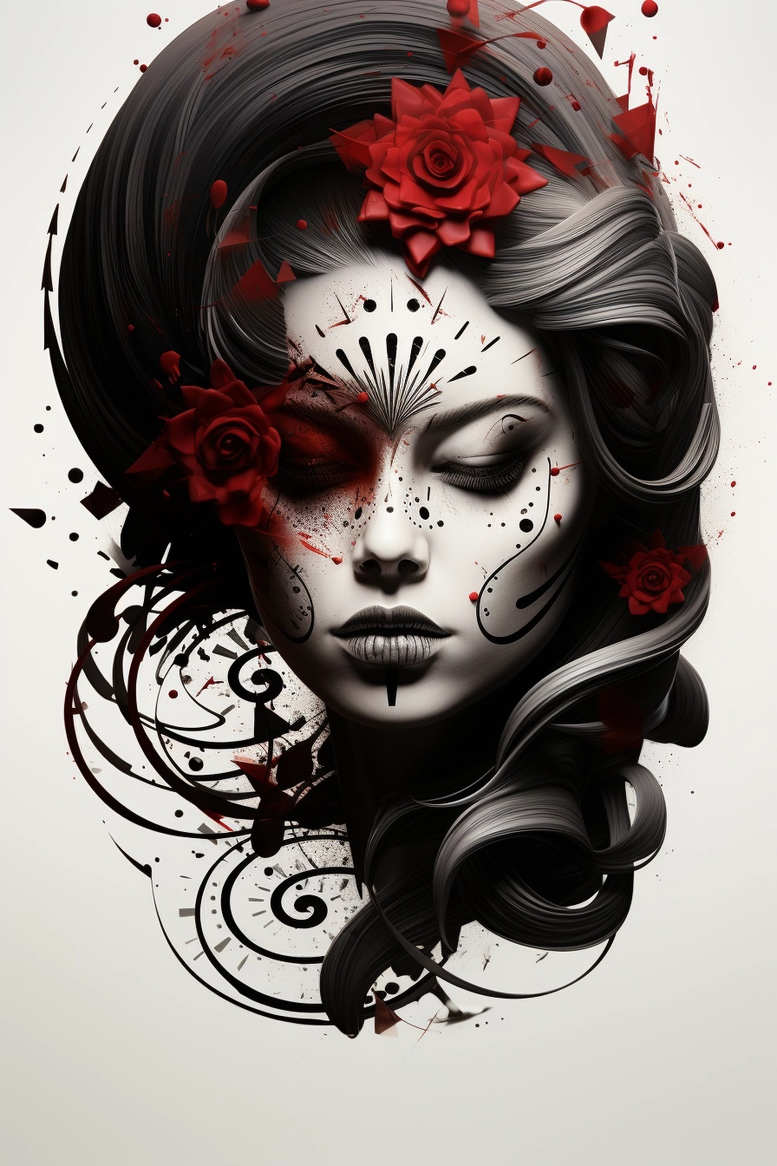 Created as an AI-generated tattoo concept, this portrait fuses graphic linework with painterly shading to produce a striking black-and-grey design. The central element is a woman’s face rendered in soft grayscale, eyes closed, lips slightly parted, exuding calm and mystery. Her long hair forms sweeping arcs that cradle the composition, while vivid red roses punctuate the crown and temples, providing a bold color counterpoint to the monochrome palette. Surrounding the face are ornamental flourishes—curvilinear swirls, teardrop motifs, and splatter-like splashes—that echo art nouveau sensibilities and modern tattoo aesthetics. The result is a cohesive tattoo design concept in which negative space, contrast, and rhythm guide the eye, making it suitable for large-area placements such as the shoulder, chest, or back. The piece blends traditional symbolism with contemporary technique: roses symbolize love and resilience, the mask-like markings around the eye suggest ritual or heritage, and the circular motifs imply infinity or continuity, inviting personal interpretation. Technically, the concept leans on fine-line precision and controlled shading to achieve depth without losing clarity at smaller scales, while the bold linework around the hair edges anchors the silhouette. For those seeking a cover-up, the dense blacks and integrated patterns offer strong concealment opportunities while preserving dramatic impact if reinterpreted in skin tones. This AI-generated tattoo project demonstrates how digital ingenuity can translate into meaningful ink, combining realism and stylization in a single cohesive design. As you apply keywords such as tattoo, tattoo design, meaningful tattoos, fine line tattoo, rose tattoo design, infinity tattoo, black and grey, or ink, this concept remains adaptable to variations—evolving from a standalone piece to a personalized custom tattoo design that respects the wearer’s anatomy and storytelling.