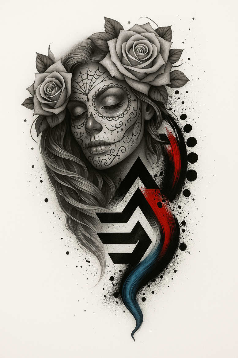 This AI-generated tattoo project presents a refined portrait that blends the elegance of a sugar skull with botanical romance. The central figure is a serene face, rendered in a grayscale palette with sugar skull filigree tracing the brow, cheeks, and jaw, evoking Día de los Muertos imagery. In the hair rest two grayscale roses with meticulous petal shading, while a long, flowing braid threads through the composition, adding organic movement. A bold geometric chevron motif cuts across the lower left, its solid black forms contrasted by a red and blue brush stroke that echoes the figure’s contour, lending a contemporary edge. The technique combines fine-line precision, smooth gradient shading, and dot-work textures to achieve a realism-inflected illustration while keeping the image clearly illustrative. Although the piece is crisp and graphic, it carries subtle softness in the shading of the face and petals, suggesting a timeless meaning: beauty and mortality intertwined. The symbolism blends Dia de los Muertos iconography with modern tattoo language; roses signify love and resilience, the skull motif honors memory, and the chevron implies forward movement. As a tattoo design concept, this piece works well as a standalone statement or as a cover-up-oriented project with careful planning, given its dense dark areas and strong negative space. It also allows flexibility for adaptation: a Japanese-style influence or a pure black-and-grey aesthetic can be explored, or the color accents adjusted to suit taste. This AI-origin concept demonstrates how tattoo ideas can become meaningful tattoos with a refined balance of traditional symbolism and contemporary graphic appeal, aligning with trends in fine-line tattoo, black and grey, flower tattoos, and custom tattoo design.