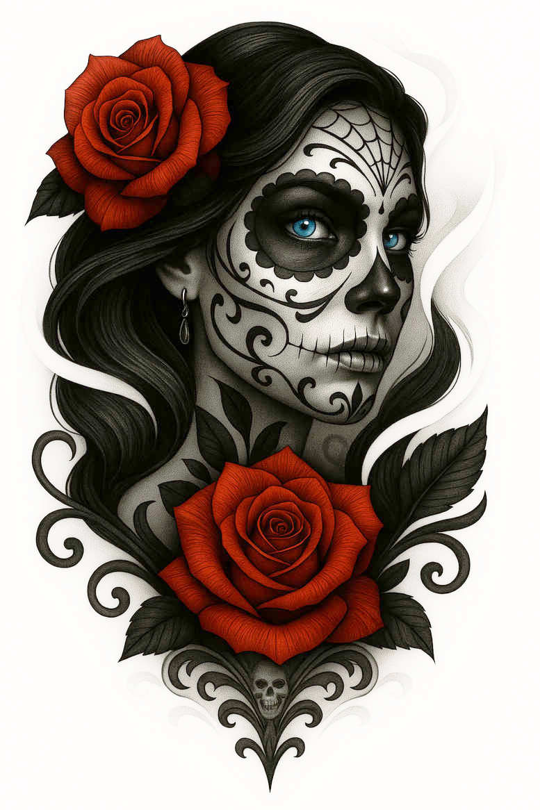 These AI-generated tattoo projects explore a sugar skull motif fused with romantic florals in a single portrait. The composition centers on a woman’s face rendered in grayscale with careful shading to achieve a lifelike tone, while the eyes are rendered in a piercing blue to draw attention. Intricate black linework forms lace-like filigree around the temples and jaw, with a spiderweb-inspired pattern across the forehead that nods to traditional sugar skull aesthetics. Two crimson roses anchor the piece—one tucked into the hair and another at the throat—providing a vivid color contrast that enhances rhythm and balance. A small skull motif sits at the base, linking mortality and beauty in a single, cohesive image. Technically, the tattoo design blends smooth gradients for the skin with crisp contour lines for the ornate patterns, and the roses are shaded to resemble velvety petals. The overall mood is refined black-and-grey realism punctuated by red highlights, making it suitable as a cover-up concept that can hide older ink while preserving a strong narrative. This design invites interpretation around themes of memory, transformation, and love, making it meaningful tattoo design and a compelling choice for rose tattoo design fans, as well as those drawn to sugar skull imagery. The AI origin is evident in the precision of the linework and the consistent typography of the patterns, reflecting a modern approach to tattoo ideas and ink evolution. As a cover-up-ready concept, it demonstrates how a bold portrait with floral elements can coexist with the subtlety of fine line detailing and the depth of black and grey shading, while remaining versatile for placement on the arm, shoulder, or back. Clients can adapt line density, adjust color saturation for stronger red pops, or scale the piece for different body placements, underscoring its suitability for meaningful tattoos, custom tattoo design, and body art enthusiasts looking for a sophisticated yet striking tattoo project.