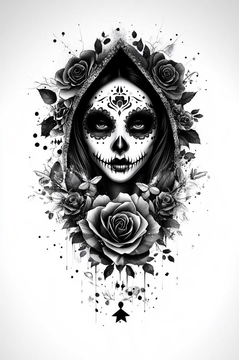 AI-generated tattoo project presents a high-contrast portrait of a hooded woman wearing Day of the Dead sugar skull makeup, framed by a wreath of roses and scattered leaves. The central face is carved with ornate black lines around the eyes, a darkened nose cavity, and a serrated smile that echoes traditional sugar skull motifs while the hood creates a cradle of shadow around the features. Roses anchor the composition at the top and bottom, their layered petals rendered in meticulous shading, with foliage filling the negative space to produce a natural, organic flow. The piece relies on black and grey gradation, crisp linework, and subtle stippling to achieve depth, realism, and a slightly ethereal quality. Drips and splashes accent the edges, giving the impression of ink bleeding into the floral border and suggesting movement across the skin. This tattoo design blends modern realism with classic symbolism: the skull honors memory and mortality, the roses symbolize beauty and resilience, and the hood implies mystery and protection. It serves as a powerful statement piece that can be placed on the shoulder, back, or chest, yet remains adaptable to smaller canvases through careful scaling of linework and shading. For anyone considering meaningful tattoos with dramatic impact, this is a strong option within the realms of tattoo, tattoo design, and custom tattoo design, especially for fans of black and grey work, fine line tattoo aesthetics, and flower tattoos. The composition also nods to Japanese-influenced precision in line control and balanced symmetry, while staying true to western sugar skull iconography. As an AI-generated tattoo project, it demonstrates how dense black mass, negative space, and floral elements can combine for a striking cover-up-ready design, making it a compelling choice for a cover-up transformation while preserving a bold, iconic visual.