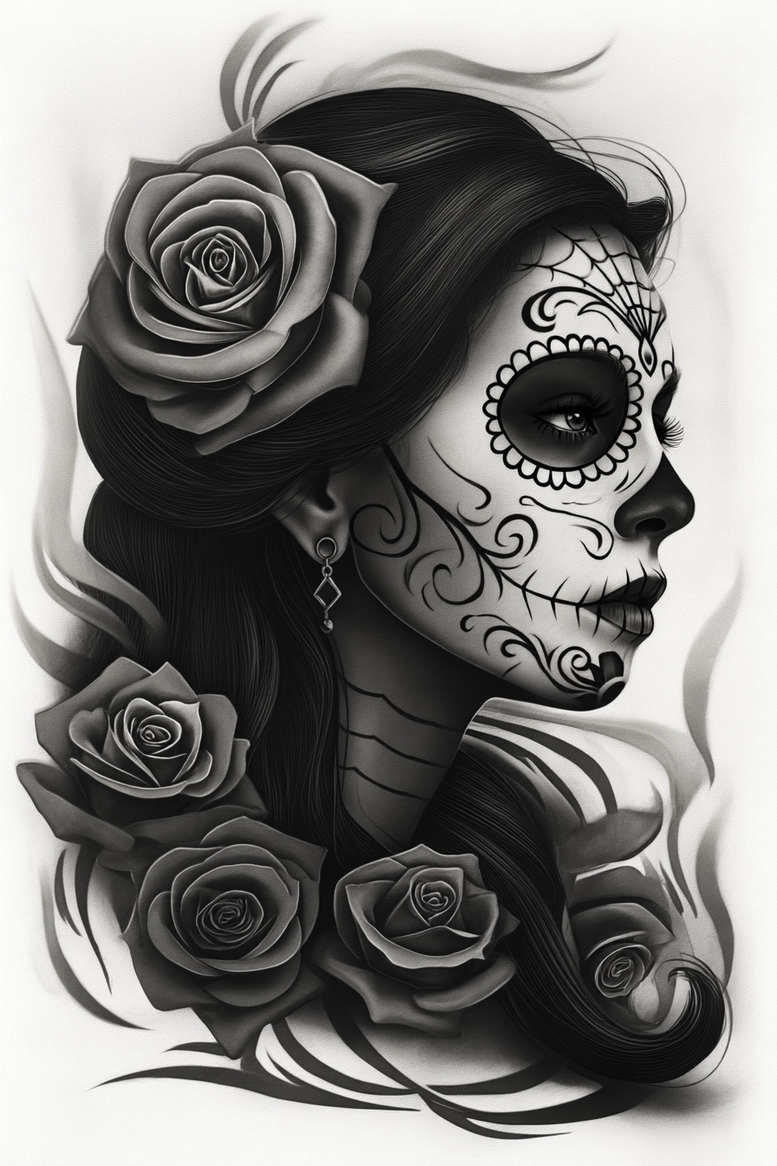 This tattoo design concept presents a monochrome, black-and-grey portrait inspired by sugar skull motifs, rendered as a woman’s profile with elaborate face decoration and floral accents. The focal point is the sculpted face painted with sugar skull patterns: a circular scalloped ring around the eye, filigree lines, and a stitched smile that blends seamlessly into the natural contours of the cheek and jaw. The hair flows in soft, precise strokes that cradle several large roses, each petal shaded to achieve a three-dimensional look; a delicate earring peeks from the lobe, adding a touch of jewelry to the composition. The neck carries a series of restrained swirls and lines that echo the patterns on the face, balancing positive and negative space and creating a cohesive sleeve or back-piece idea. The overall mood is refined and romantic, juxtaposing themes of mortality and beauty in a classic black and grey palette common to fine line and realistic tattoo design. The piece is suitable for a larger, statement tattoo or as a set of smaller, interconnected motifs for a meaningful sleeve. In terms of technique, the design draws on smooth gradient shading, crisp linework, and careful contrast to emphasize form and depth; the roses are rendered with layered shading to create lifelike petals, while the sugar skull elements are stylized but recognizably Day of the Dead-inspired. The symbolism is deliberate: the roses symbolize love and memory, the skull motif honors endurance and transformation, and the swirling vines suggest continuity between life and ink. For those seeking a ‘tattoo design’ with personal significance, this concept fits as a permanent expression of style and meaning, whether placed on the shoulder, upper arm, or along the side of the ribs. Keywords such as tattoo, tattoo design, meaningful tattoos, fine line tattoo, lotus flower tattoo, infinity tattoo, tribal tattoo, rose tattoo design, small tattoos, flower tattoos, custom tattoo design, Japanese style tattoo, black and grey, realistic tattoo, body art, ink are woven throughout to help guide artists and clients toward a precise interpretation. If a client desires heavier linework or a more dramatic contrast, the design can be adapted into a bolder, macro-liner piece while preserving the same symbolic core. This is an AI-generated tattoo project concept intended to inspire a real-world tattoo.