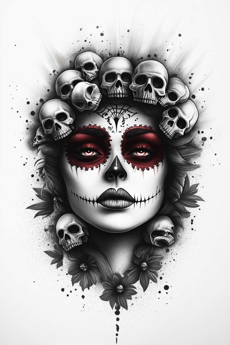An AI-generated tattoo project concept presenting a sugar skull portrait rendered in black and grey, with a striking red accent around the eyes. The composition centers on a calm, symmetrical face whose features are shaped by soft gradient shading and fine line work, while a crown formed from an arch of skulls creates a circular halo above the head. Surrounding the portrait, leaves and layered flowers thread downward toward the neck, establishing a balanced frame that reinforces the Dia de los Muertos motif without overloading the composition. The mouth is subtly stitched with a decorative nautilus-like line and a small highlight on the nose adds dimensionality, giving the design a sculptural feel. The overall piece reads as a tattoo design that blends realism with illustrative precision, offering bold contrast, smooth gradients, and crisp contours that translate well into black and grey ink. The symbolism of skulls and blossoms speaks to themes of life and death, memory and rebirth, making it a meaningful tattoo design for someone seeking a statement piece with personal resonance. In terms of technique, the concept leverages controlled stippling, soft feathering around the jaw and cheeks, and deliberate negative space to maximize depth while preserving skin texture. As a cover-up-ready concept, the heavy blacks and dense shading provide excellent concealment of older ink while creating a dramatic canvas for new ink, and this is reiterated by the suggestion that the piece can be adjusted to alter size and placement for different body areas. The AI-origin of the concept underscores how modern generative ideas can inform tattoo design that remains respectful of cultural references, drawing from Japanese-style balance and floral motifs to produce a contemporary, realistic tattoo aesthetic. For discoverability, the text integrates keywords such as tattoo, tattoo design, meaningful tattoos, fine line tattoo, lotus flower tattoo, infinity tattoo, tribal tattoo, rose tattoo design, small tattoos, flower tattoos, custom tattoo design, Japanese style tattoo, black and grey, realistic tattoo, body art, ink, all while maintaining an authoritative tone suitable for a professional publication about art and tattoo practice. If used as a cover-up, the heavy black shading and skull motif offer strong concealment and a compelling avenue for new ink.