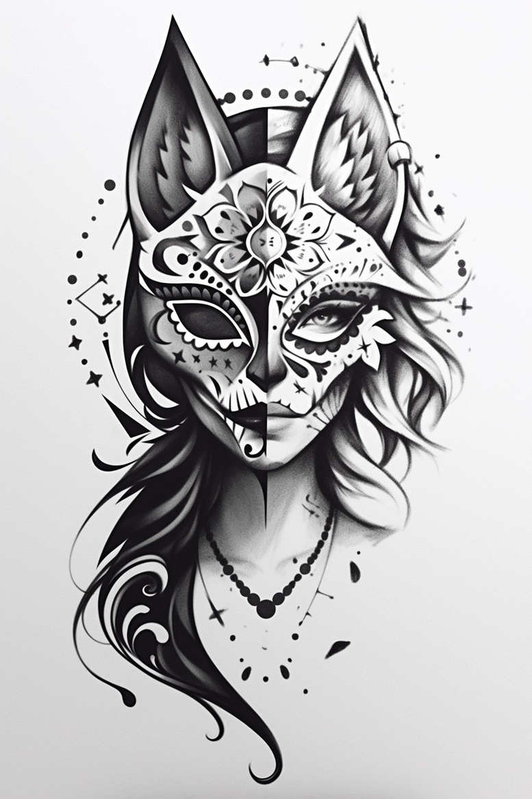 An AI-generated tattoo project presenting a dramatic, split-face portrait that merges a cat-inspired masquerade mask with a lifelike female visage adorned with floral motifs. Rendered in black and grey, the piece relies on bold negative spaces and crisp linework to achieve both graphic impact and subtle shading. The left half features a stylized mask with pointed ears and ornamental patterns, while the right half reveals a realistic eye, delicate lips, and flowing hair threaded with lace-like floral accents. Central to the composition is a lotus- or flower-like bloom on the forehead, complemented by a beaded necklace that drapes down the neck. Surrounding geometric elements and tiny stars add movement, giving the work a contemporary tattoo aesthetic. The concept suits a larger placement on the shoulder blade, chest, or back, yet it remains adaptable to smaller areas through selective scaling of line weight and shading. The twin motifs symbolize dual identities—concealment versus revelation—while the floral details convey growth, resilience, and beauty. The design embraces traditional tattoo vocabulary alongside modern design language: black and grey realism tempered with fine-line ornament and abstract accents, enabling both dynamic contrast and timeless readability. For meaning, it pairs the mystery of a mask with the warmth of an open, expressive portrait, making it an ideal choice for meaningful tattoos, including lotus flower tattoo, flower tattoos, and even small tattoos when scaled appropriately. This project is AI-generated tattoo concept; it is presented as a custom tattoo design ready for adaptation by an artist to fit anatomy and skin tone. Its strong contours provide excellent cover-up potential on older ink, while the floral right side preserves clarity and longevity as the piece ages. Artists can tailor line weights, shading gradients, and spacing to align with Japanese style tattoo influences and the broader black and grey canon, merging realism with stylized expression to deliver a powerful body art statement. In sum, the image offers a bold exploration of identity and artistry through a mixed-motif composition that sits at the intersection of modern tribal-inspired geometry and classic portraiture, a fitting example of the tattoo design that resonates with meaningful tattoos, ink, and the enduring appeal of black and grey, fine-line craftsmanship.