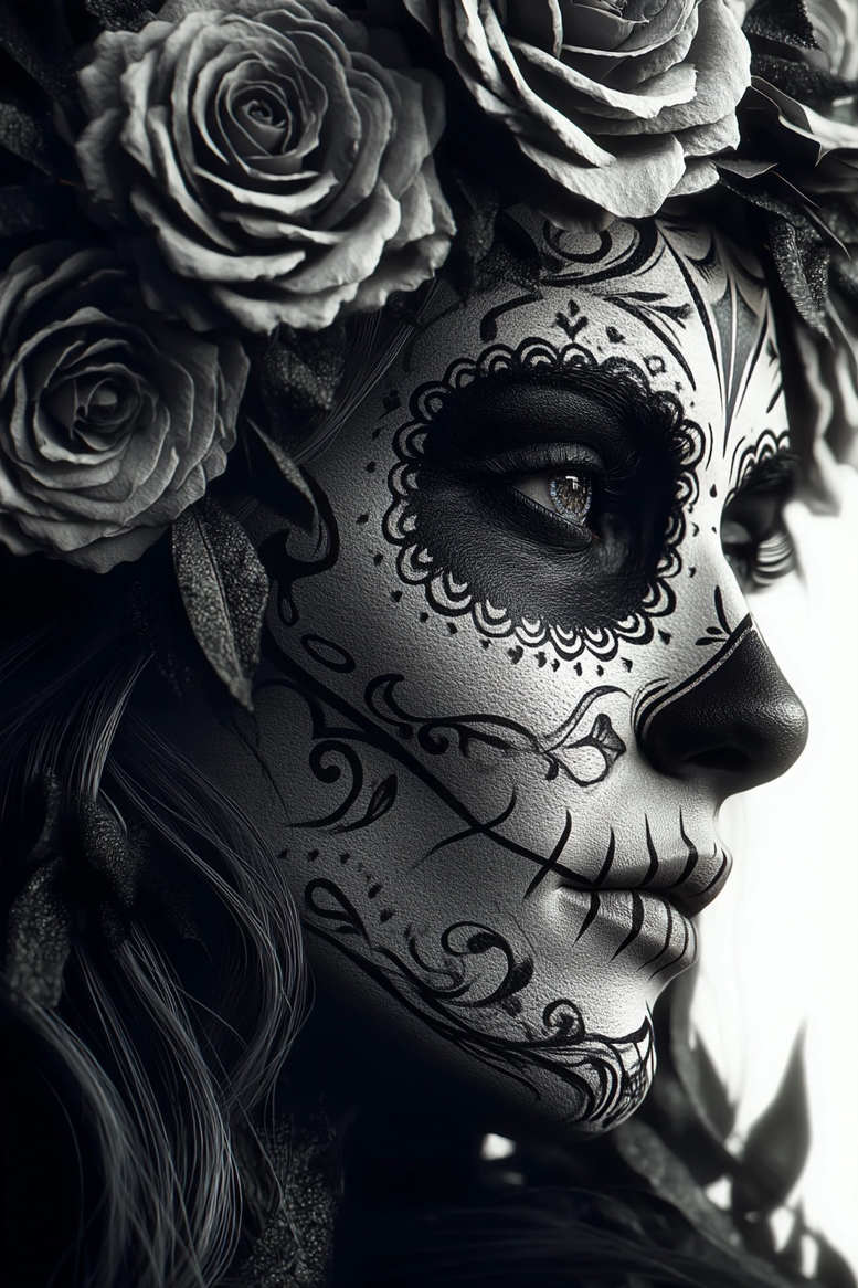 This AI-generated tattoo project presents a striking, high-contrast portrait inspired by sugar skull imagery, rendered in black and grey. The subject is a female profile adorned with intricate lace-like patterns around the eye, created with dense, flowing lines that emphasize depth and texture, while a crown of roses frames the temples and forehead. The technique suggests a fine line approach with smooth shading to simulate skin depth, blending realistic tattoo aesthetics with Dia de los Muertos motifs. The eye socket becomes a focal point, surrounded by a circular rim of petals, dots, and filigree that echo traditional lace and modern ornament. The nose and lips are stylized with skeletal hints, yet kept elegant to preserve a wearable silhouette. The overall composition marries symbolism—remembrance, transformation, beauty—with bold black ink contrast, making it a powerful statement piece. The roses provide a natural counterpoint to the skull framework, suggesting growth and resilience, while the crown-like floral element adds regality. As a tattoo design, this concept translates well to placements such as the cheek, jawline, or side of the head, and can be scaled to maintain the balance between negative space and solid ink. Given the dense dark shading and high-contrast linework, the piece is well-suited as a cover-up for older or dark-tinted tattoos, where solid blacks can help mask underlying pigments.
