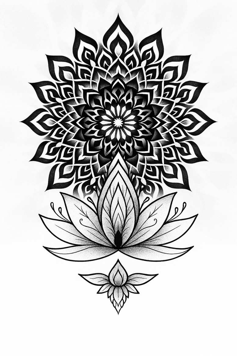 AI-generated tattoo project presents a bold two-tier composition: a central mandala of layered, pointed petals radiating from a tight core, positioned above a stylized lotus with broad, veined leaves. Executed in black and grey with precise linework and subtle stippling, the piece relies on fine line tattoo technique to create depth and texture without overwhelming detail. The mandala embodies harmony, balance, and spiritual focus, while the lotus represents purity, awakening, and resilience—an enduring pairing for meaningful tattoos. The vertical layout makes it versatile for placements along the forearm, upper arm, back, or thigh, with the mandala serving as the dramatic centerpiece and the lotus anchoring the design. The execution emphasizes symmetry, consistent needle frequency, and controlled ink density to maintain legibility as skin ages, a key factor for a reliable cover-up concept where darker elements can help obscure existing marks while the lighter lotus provides contrasting emphasis. From a technical standpoint, crisp contours, even line weight, and deliberate spacing contribute to longevity, and the high-contrast black and grey palette ensures durability across skin tones. For clients seeking adaptation, the lotus motif can be extended with infinity tattoo motifs, subtle florals, or subtle Japanese style tattoo accents without sacrificing the core silhouette, enabling a modular path toward a larger tribal tattoo or rose tattoo design if desired. This project is an AI-generated tattoo concept intended as a starting point for collaboration with a licensed artist, containing a ready-to-refine framework that remains fashionable as a standalone piece or a component of a sleeve. In the broader context of tattoo art, it meets the desires of enthusiasts for fine line, small tattoos, and meaningful tattoos, while offering a timeless black and grey aesthetic that suits both everyday wear and formal settings. When viewed as a cover-up concept, the dense mandala provides substantial ink density to mask prior work, and the lotus offers a bright focal point to draw attention away from treated areas, making it an attractive path for those pursuing a successful cover-up.