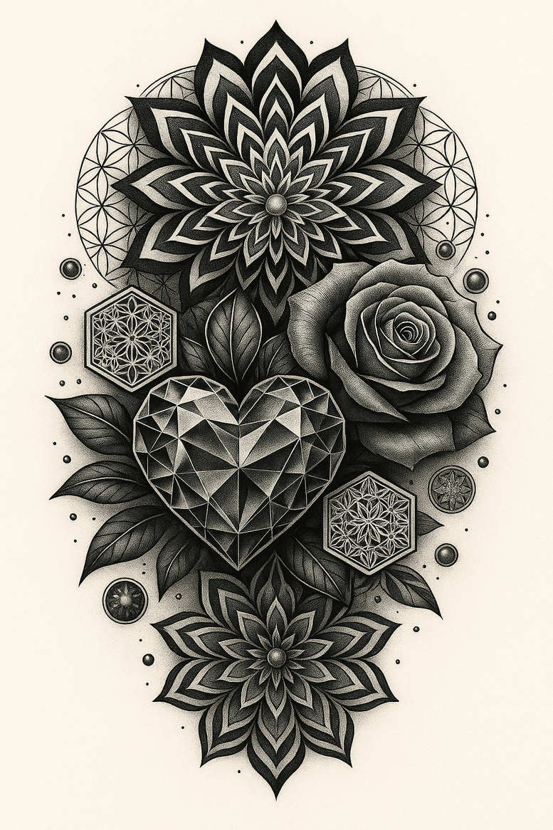 This AI-generated tattoo project presents a vertical composition that fuses a faceted geometric heart with a rose and layered mandala-inspired blooms, surrounded by leaves and geometric hexagon motifs. The central heart is carved from tessellated facets, creating a jewel-like focal point that anchors the piece, while the adjacent rose provides natural contrast with soft petals and subtle shading. The surrounding mandala flowers add symmetry and rhythm, their layered petals radiating outward to convey balance and harmony. Hexagonal geometric shapes and interlocking petal patterns weave a structural lattice through the design, giving it a modern, architectural edge that sits comfortably on the skin. Leaves frame the collage, adding movement and organic tension that keeps the piece grounded in nature even as the geometry speaks to precision and order. The shading transitions from fine-line lines to deeper blacks, producing a black and grey realism that reads clearly from a distance and up close, making it suitable for larger canvases like the back, chest, or sleeve. Symbolically, the heart stands for love and commitment, the rose for beauty and resilience, while mandala petals evoke mindfulness and focus; the geometric tessellations suggest interconnectedness and balance. This piece is versatile for both standalone large-scale ink or a wrap design around a limb, and its dense black areas make it an excellent cover-up option for older tattoos. For collectors seeking meaningful tattoos, this design offers a sophisticated blend of fine-line technique and geometric precision, aligning with contemporary trends in tattoo art while delivering timeless symbolism. As an AI-generated tattoo project, it demonstrates how machine-generated concepts can be refined into compelling body art ideas and ready for collaboration with an artist to create a polished, commission-ready tattoo design that emphasizes black-and-grey realism, precise line work, and a striking central motif. Keywords to consider include tattoo, tattoo design, meaningful tattoos, fine line tattoo, lotus flower tattoo, infinity tattoo, tribal tattoo, rose tattoo design, small tattoos, flower tattoos, custom tattoo design, Japanese style tattoo, black and grey, realistic tattoo, body art, ink.