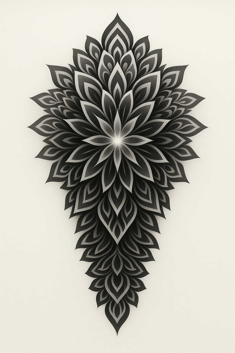 This AI-generated tattoo project presents an intricate mandala-inspired floral motif rendered in black and grey fine line technique. The central glow radiates from the heart of the design, where stacked petal shapes cascade outward into progressively broader layers, creating a symmetrical, almost sacred geometry that suggests balance, unity, and inner growth. The piece reads like a single, cohesive bloom, yet upon closer inspection reveals repetition and rhythm in the petal edges, each outlined with precise linework and delicate shading that adds depth without breaking the overall softness of the design. The contrast between solid black areas and soft grey gradients allows the piece to hold detail at various sizes, making it suitable for larger canvases such as the back, shoulder blade, or chest, while remaining legible as a small tattoo when scaled down. The mandala’s outward momentum and the sharp, leaf-like tips evoke both botanical and spiritual symbolism, aligning with meanings associated with growth, harmony, and transition. From a technical perspective, the tattoo relies on fine-line shading and crisp contour lines to achieve a luminous, center glow while maintaining dense exterior symmetry. For collectors seeking meaningful tattoos, this floral mandala functions as a standalone piece or a compatible element in a broader sleeve concept, and it sits comfortably within black and grey realism and geometric traditions. The design qualifies as a strong fit for a cover-up due to its dense linework and deep shading, which can be used to mask previous marks while integrating a new focal point. As an AI-generated tattoo project, it demonstrates how algorithmic design can yield precise, repeatable motifs suitable for bespoke tattoo design workflows, enabling clients to explore refined, scalable body art that remains true to the essence of a classic mandala-inspired flower motif, while preserving the option of further personalization in color or line density. Keywords to consider when pairing this piece with a portfolio or a tattoo studio’s catalog include tattoo, tattoo design, meaningful tattoos, fine line tattoo, lotus flower tattoo, infinity tattoo, tribal tattoo, rose tattoo design, flower tattoos, custom tattoo design, Japanese style tattoo, black and grey, realistic tattoo, body art, ink.