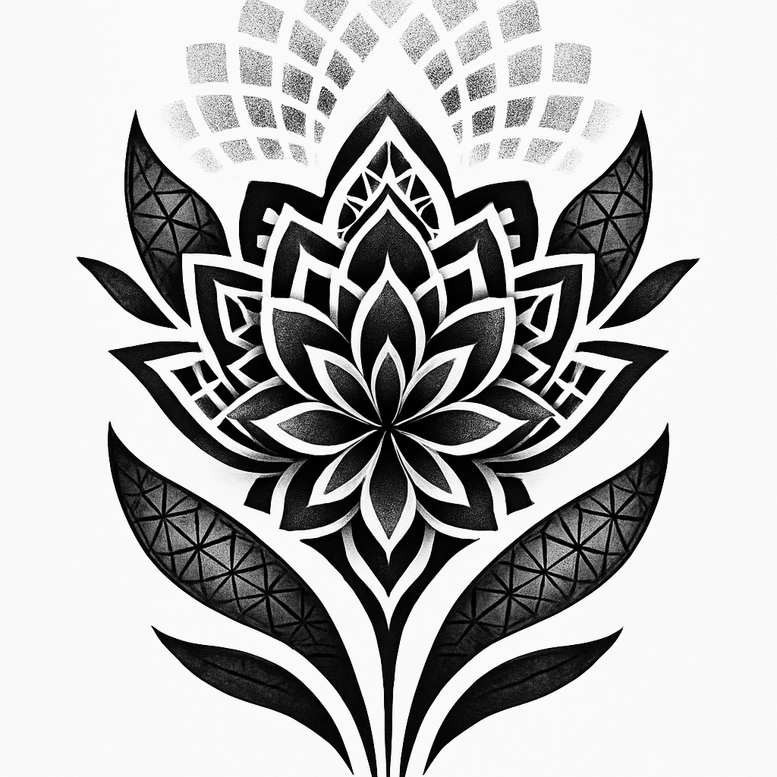 An AI-generated tattoo project presenting a symmetrical black and grey lotus mandala, built from concentric petals that radiate from a stylized core. The central flower features layered teardrop petals with crisp edge lines, surrounded by an outer ring of pointed leaves and geometric shading that creates depth. The upper portion explores a dotted gradient halo while the lower stem and leaf motifs curve gracefully to anchor the composition on the skin. The design relies on negative space and cross-hatching to achieve a rich black and grey palette, suitable for broad coverage on limbs or the back. Technique-wise, expect clean fine-line outlines, smooth gradient shading, and careful contrast to ensure legibility as the tattoo ages. This is not a realistic portrait but a stylized lotus flower tattoo design blending traditional symbolism with contemporary geometry; the lotus often represents enlightenment and rebirth, while the mandala pattern emphasizes balance and unity. The black ink with grey shading contributes to longevity and timeless appeal, aligning with trends in fine line tattoo, black and grey realism, and geometric body art. For clients seeking small tattoos or larger sleeve concepts, the piece functions as a versatile foundation and can be expanded with infinity tattoo motifs, rose tattoo design accents, or flower tattoos themes. As an AI-generated tattoo project, it serves as a concept starter showing how precise linework, shading, and symmetry can produce a bold yet elegant piece, especially as a cover-up where darker ink can effectively mask older ink. The result is a meaningful tattoo design with strong visual impact, adaptable to different body sites and skin tones, and suitable for those pursuing meaningful tattoos, Japanese style tattoo influences, or tribal tattoo-inspired compositions. Ideal placements include forearm, calf, shoulder, or back; it scales well and respects anatomical contours, making it a timeless choice for meaning seekers.
