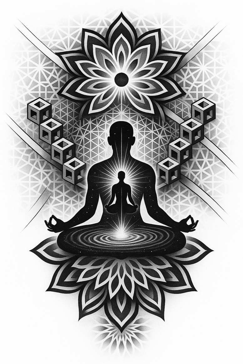An AI-generated tattoo project that fuses spiritual symbolism with geometric architecture, presented as a cover-up ready composition. At the center sits a bold silhouette of a meditating figure, shoulders relaxed and spine upright, hands forming a classic mudra. The silhouette is rendered in deep black with subtle grey shading that gives a radiant halo around the head, hinting at inner enlightenment. Behind and beneath the figure, a double lotus motif anchors the piece: a large lotus base expands into layered petals while a secondary lotus blooms overhead, its petals interlaced with a lattice of fine lines. Framing these organic forms is a diagonal cascade of geometric cubes, alternating in dark and light tones to create a striking tension between nature and structure. A concentric ripple emanates from the figure’s seated core, symbolizing the stilling of the mind and the resonance of intention through space. The overall composition is executed in black and grey to deliver crisp lines and smooth shade transitions suitable for long-term wear. The design benefits from high contrast and clear silhouettes that translate well to both small tattoos and larger canvases, and it adapts to placement on the back, chest, or arm without losing balance. The lotus motif evokes purity, rebirth, and spiritual growth, while the cube elements convey stability and progression, making this a meaningful tattoo design for someone seeking a modern interpretation of traditional symbols. For those drawn to Japanese-inspired motifs and geometric precision, the combination reads as a contemporary sacred geometry piece with strong lines and a balanced composition that remains legible from a distance. This description intentionally includes keywords such as tattoo, tattoo design, meaningful tattoos, fine line tattoo, lotus flower tattoo, infinity tattoo, tribal tattoo, rose tattoo design, small tattoos, flower tattoos, custom tattoo design, Japanese style tattoo, black and grey, realistic tattoo, body art, ink. As an AI-generated tattoo project, it demonstrates how algorithm-driven concepts can produce powerful, scalable body art with a built-in cover-up capability, and given the dense black areas, this concept is particularly well-suited for covering existing tattoos while delivering a bold, timeless image.
