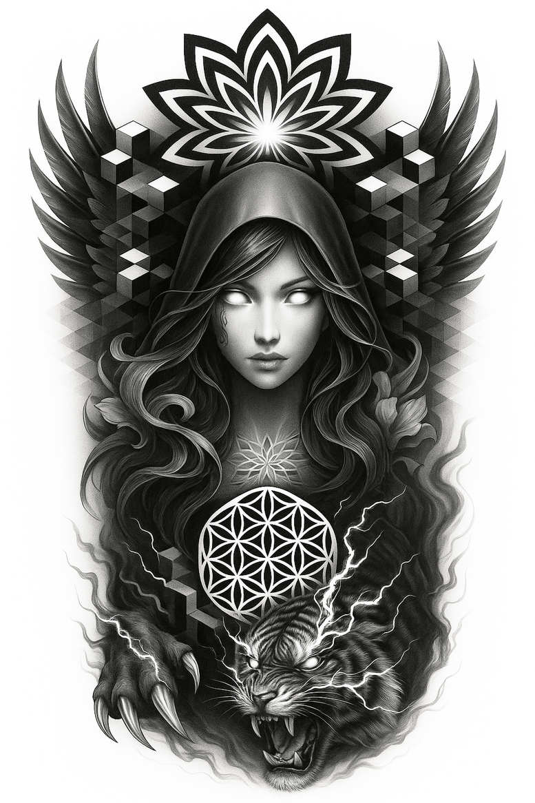 AI-generated tattoo project presented as a single-panel, black-and-grey composition, this design centers on a hooded female figure framed by expansive wings, with disciplined shading that gives the illusion of depth and softness in the skin tones while maintaining a crisp edge on the line work. Behind her, a tessellated geometric pattern of cubes dissolves into a luminous flower of life motif, while at the lower edge a fierce tiger snarls, its mane and roars threaded with electric bursts that ripple through the surrounding ink. The piece relies on careful layering of negative space and gradual tonal transitions to achieve realism within a symbolic, almost mythic scene. The woman’s calm, almost trance-like gaze contrasts with the savage energy of the tiger, suggesting a balance between protection and inner ferocity. The Flower of Life symbol—a universal geometric pattern—serves as a center of focus on the chest, hinting at interconnectedness, creation, and universal design, while the surrounding wings imply ascent and guardianship. The geometric blocks give the piece a modern, digital edge, bridging Japanese and Western aesthetics in a single cohesive composition. In technique, the artist uses fine line outlines, smooth black-and-grey shading, and subtle gradient transitions to preserve legibility over larger skin areas, with selective white highlights to emphasize the glow around the circle and the eyes. The overall silhouette flows with the body’s natural curves, making it suitable for placement on the back, chest, or thigh as a large, meaningful tattoo design that can be adapted to a full sleeve. As an AI-generated tattoo project, it showcases how algorithmic ideas can translate sacred geometry, animal symbolism, and portraiture into customizable ink. When used as a cover-up, the dense shading and overlapping shapes provide ample opportunity to conceal previous work with a well-planned redraw, while maintaining a striking, timeless look. For the client seeking meaningful tattoos, this piece blends themes of protection, power, and cosmic harmony—an ideal choice for a bold black-and-grey tattoo design with lasting impact.