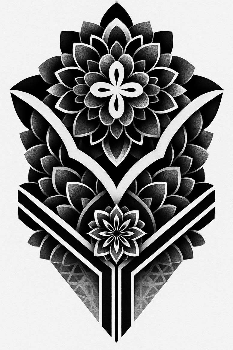AI-generated tattoo project presenting a monochrome lotus motif arranged in a layered, mandala-like composition that fuses floral symmetry with angular geometry. The central lotus blossoms are rendered in high-contrast black and grey shading, with crisp white highlights that carve each petal edge and create depth, while a bold chevron framework anchors the piece and guides the eye along the body. Surrounding petals repeat along the outer curves, forming a hypnotic rhythm that scales gracefully from forearm to back, and the lower wedges introduce a structured lattice that hints at infinity tattoo and continuity. The design relies on precise linework, stippling, and gradient shading to deliver a refined, graphic look that can be executed as a large full-back piece or adapted to a forearm sleeve, chest panel, or small, bold tattoo. The lotus symbol embodies purity, spiritual awakening, and resilience, making this a meaningful tattoo design choice for those seeking personal meaning, while the geometric scaffolding adds modernity and discipline. The piece is well suited for black and grey ink, maintaining legible contrast on textured skin and during aging, and the dense dark areas make it an excellent candidate for a cover-up if needed, preserving detail while effectively masking previous ink. As an AI-generated tattoo project, it showcases a contemporary interpretation of traditional motifs, delivering a pattern-driven concept that suits both minimalist and expansive layouts, whether you’re after a Japanese style tattoo influence, mandala-inspired symmetry, or a bold statement set of floral linework. In sum, this is a versatile, custom tattoo design built around the lotus aesthetic, offering meaningful tattoos, fine line tattoo potential, and enduring body art appeal for enthusiasts and artists alike, with potential for rose tattoo design compatibility and broader flower tattoos collections.