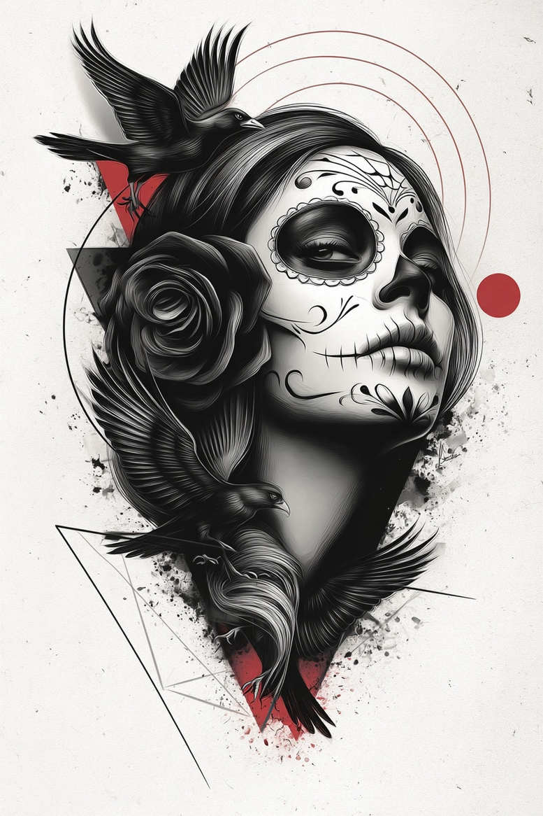 AI-generated tattoo project presents a Day of the Dead sugar skull motif reimagined as a contemporary portrait that blends realism with ornamental line work. The central face is rendered in black and grey, with smooth gradients sculpting cheekbones and jaw while sugar-skull filigree wraps around the eye sockets, chin, and lips in lace-like motifs. A rose blooms near the jawline, its petals built from tight shading and subtle highlights to convey depth within the monochrome palette. Swallows sweep along the profile, their wings curving in rhythm with circular arcs and geometric triangles that give the composition a modern graphic edge. The design juxtaposes organic florals and feathered silhouettes with precise geometry, creating a dynamic tension between softness and precision. Techniques emphasize fine line work, bold shadows, and negative space to achieve clarity at both small and large scales, making it adaptable as a small tattoo or a larger back or sleeve piece. Symbolism intertwines life and death, transformation and resilience: the rose representing beauty and the skull mortality, while birds symbolize freedom and movement. The piece is described as black and grey with intricate patterning, appealing to meaningful tattoos, rose tattoo design, small tattoos, and flower tattoo ideas, as well as custom tattoo design trends. For cover-up purposes, the strong dark areas and dense shading offer a robust foundation for concealing existing ink while preserving detail. This is an AI-generated tattoo project, a concept piece that invites a custom interpretation by a tattoo artist, and it demonstrates how pattern, texture, and silhouette can translate into body art that is both timeless and contemporary, suitable for tattoo design portfolios and ink enthusiasts seeking sophisticated black and grey work. It also nods to lotus flower tattoo motifs.