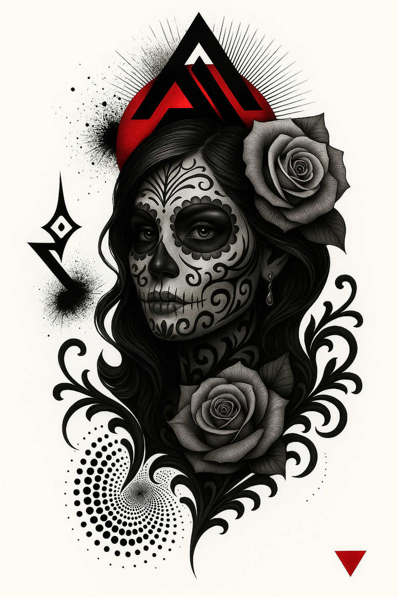 This piece presents a bold, pattern-rich sugar skull portrait rendered in black and grey. The main figure is a woman whose face is covered by calavera motifs, swirling curls, and lace-like filigree that echo traditional Dia de los Muertos symbolism while remaining highly contemporary as a tattoo design. Two roses anchor the composition: one at the temple area and another near the collar, each shaded to suggest velvety petals and subtle depth. The hair flows around the face in serpentine black lines, acting as a frame that guides the eye from the crown to the chin. In the background, red geometric shapes—triangles—provide a stark contrast and a modern edge, balancing the dense ornament with negative space. The entire work relies on crisp line work, bold black ink, and a controlled gradient of shading that creates a life-like texture across skin. The pattern elements include floral scrolls, teardrop motifs, dots, and circular stippling that radiate outward, giving the impression of movement and energy, while ensuring the tattoo reads clearly from a distance. From a technical perspective, this design favors a mix of fine-line precision for the lace-like motifs and broader shading for the skull mask, translating well to both small armbands and larger back-piece applications. Symbolically, the sugar skull honors memory and transformation, the roses symbolize love and remembrance, and the overall composition speaks to resilience and beauty amid darkness. If placed as a cover-up, the dense black areas and repeating pattern blocks offer solid coverage of older ink while preserving intricate detail in the new work. As an AI-generated tattoo project, it showcases how a contemporary illustrator can fuse traditional iconography with graphic surrealism to produce a striking body art concept that remains versatile across styles, from realistic to Japanese-inspired interpretations; the result is a timeless piece suitable for those seeking meaningful tattoos, protected by durable line work and adaptable to different body contours while maintaining the high-contrast allure of black and grey ink. This description intentionally blends tattoo design language with keywords to enhance discoverability in portfolios and search engines for black and grey rose tattoos, sugar skull designs, and pattern-driven ink.