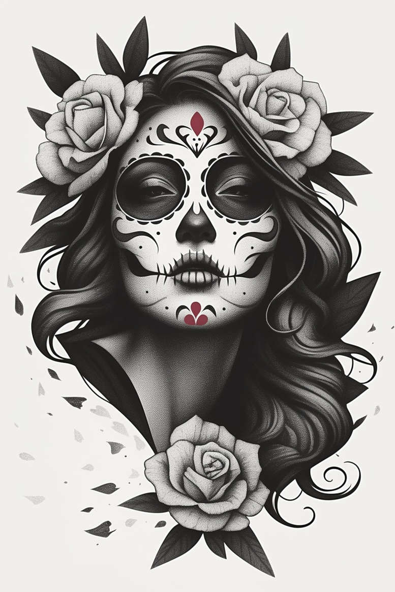 AI-generated tattoo project concept realized in black and grey, presenting a striking sugar skull portrait that fuses Dia de los Muertos symbolism with a feminine contour. The central visage is stylized with ornate filigree, scalloped eye sockets, and dotwork shading that emphasizes form while preserving a soft, realistic feel. Subtle red accents on the forehead and chin punctuate the monochrome palette, drawing attention to the symmetry of the mask and the gravity of the design. Surrounding the face, a crown of roses and curling leaves frames the composition, while flowing hair cascades in bold, sweeping lines that add motion and depth. The piece relies on crisp line work, careful gradation, and negative space to achieve a refined, high-contrast look that translates well to ink. The decorative patterns—floral motifs, lace-like borders, and delicate dots—establish a graphic texture that reads clearly at tattoo size, making this design a strong candidate for a pattern-focused approach if needed. From a technique perspective, the concept blends fine line precision with broader shading to create a believable, dimensional portrait on the skin, suitable for placements such as the shoulder, upper arm, or chest. The symbolism plays on themes of life and death, beauty and mortality, offering a meaningful tattoo design for wearers seeking a personal narrative in ink. This concept originates from an AI-generated source but is presented as a practical, customizable tattoo design, adaptable to various scales, placements, and client preferences. It emphasizes timeless black and grey ink, rose tattoo design aesthetics, and a contemporary take on Dia de los Muertos iconography while maintaining a robust, durable line quality suitable for long-term body art. Influences from Japanese style tattoo compositions and traditional floral motifs inform line density and spacing, ensuring legibility across ages and unlike overly intricate pieces, while the inclusion of rose imagery anchors the piece in universally understood symbolism of love and memory. The result is a versatile concept that works as a stand-alone tattoo design or as part of larger body art, with room for personalization such as color pops, size adjustments, and placement tweaks to suit different skin tones and lifestyles.