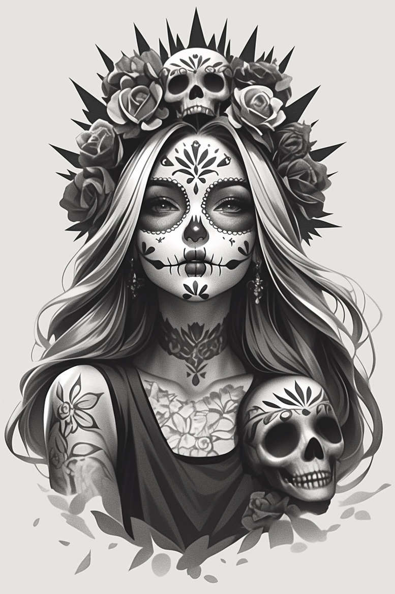 This AI-generated tattoo project presents a grayscale portrait of a woman whose face is painted with Dia de los Muertos sugar skull motifs. A crown of roses and skulls sits atop her head, while a skull rests at her shoulder and floral filigree runs across the neck and chest, merging into the sleeveless top. The design relies on smooth black-and-grey shading and fine line work to create depth, with lace-like dot work around the eyes. Roses are rendered with soft gradations; skulls with high-contrast ink to anchor the piece in a bold, graphic style. Ornamentation frames the central portrait, delivering a decorative texture suitable for tattoo design across placements from shoulder to back. The symbolism centers on life and mortality, memory and heritage, with the living figure juxtaposed against skull motifs that honor loved ones. Because this is AI-generated, it showcases a contemporary approach to concept art that blends realism with ornament and pattern. The pattern-rich motif delivers dense texture that reads well from distance and up close, while the black-and-grey palette keeps options open for a realistic or stylized finish. This design is ideal as a cover-up due to its strong silhouette and masking potential, yet it also stands as a meaningful tattoo for those drawn to rose and Day of the Dead imagery. It aligns with trends in meaningful tattoos, fine line tattoo, rose tattoo design, and black and grey realism, while remaining adaptable to custom tattoo design workflows. The AI-origin of this project situates it within a growing field of ink design that appeals to fans of modern body art seeking symbolic, meticulously rendered work.